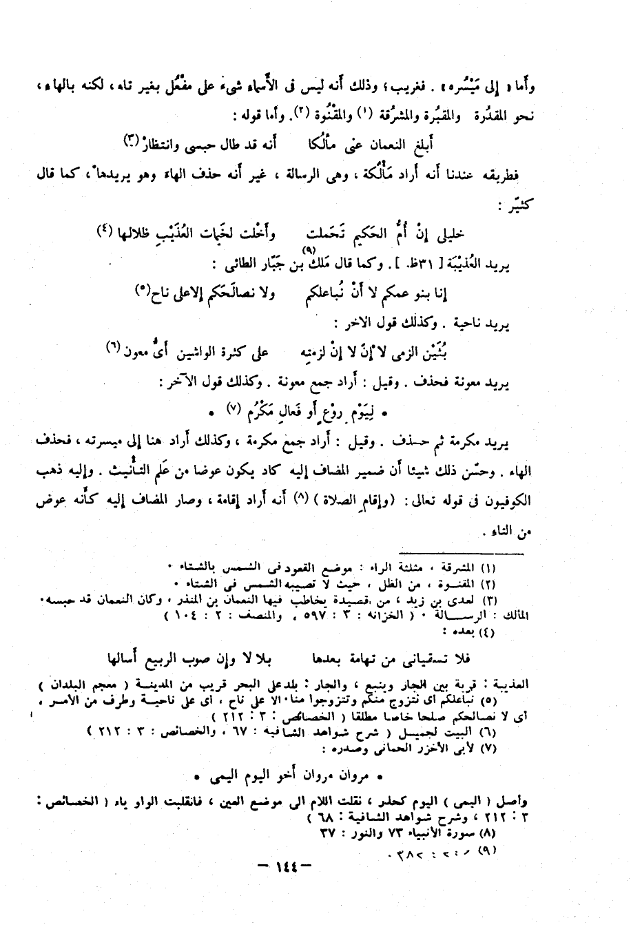 يريد: مكرمة ثم حذف، وقيل: أراد جمع مكرمة، وكذلك أراد هنا إلى ميسرته، فحذف الهاء. وحسن ذلك شيئًا أن ضمير المضاف إليه كاد يكون عوضًا من علم التأنيث، وإليه ذهب الكوفيون في قوله تعالى: {وَإِقَامِ الصَّلاةِ} 8 أنه أراد إقامة، وصار المضاف إليه كأنه عوض من التاء.