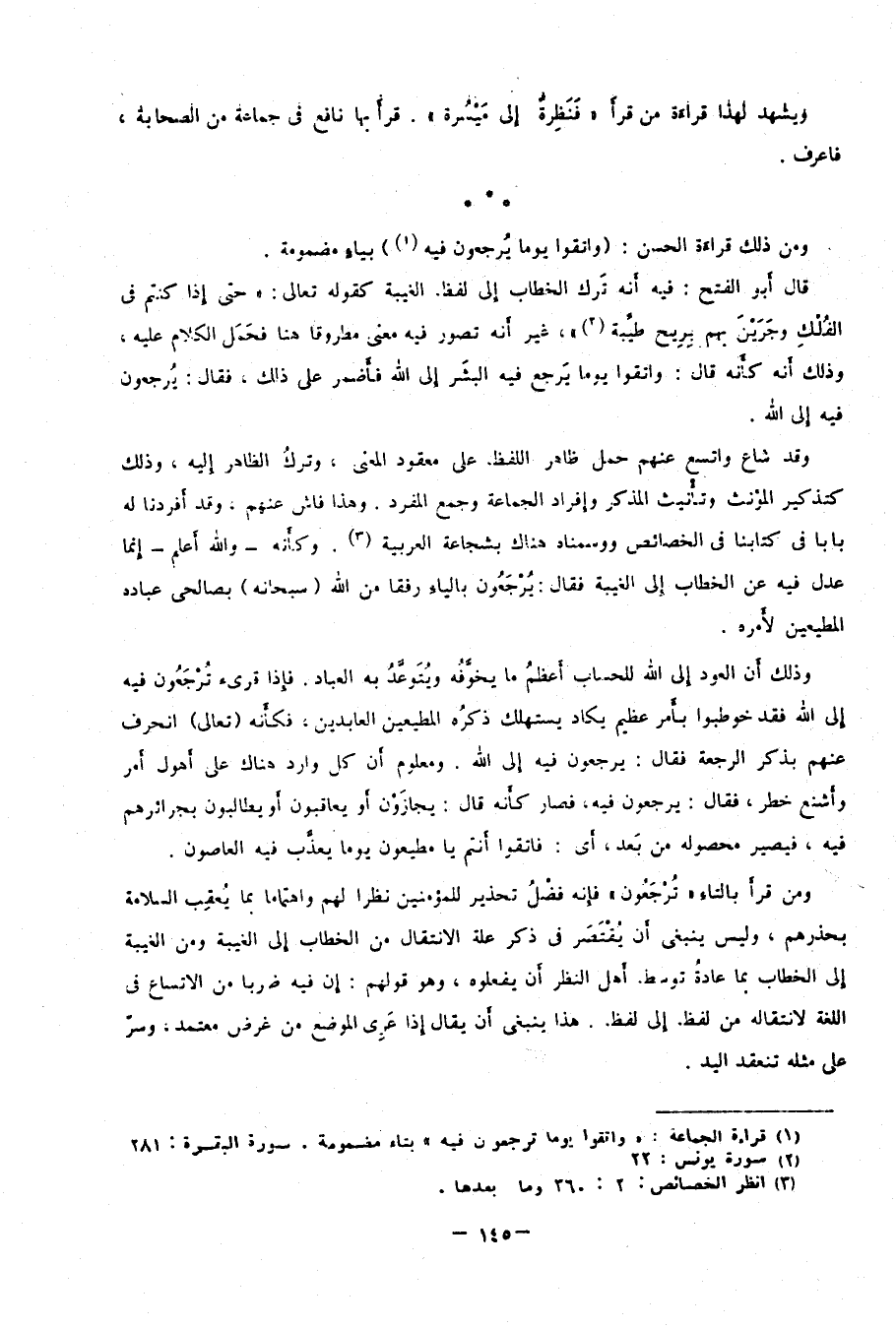 قال أبو الفتح: فيه أنه ترك الخطاب إلى لفظ الغيبة كقوله تعالى: {حَتَّى إِذَا كُنْتُمْ فِي الْفُلْكِ وَجَرَيْنَ بِهِمْ بِرِيحٍ طَيِّبَةٍ} 2، غير أنه تصور فيه معنى مطروقًا هنا فحمل الكلام عليه؛ وذلك أنه كأنه قال: واتقوا يومًا يَرجع فيه البشر إلى الله فأَضمر على ذلك، فقال: يُرجعون فيه إلى الله.