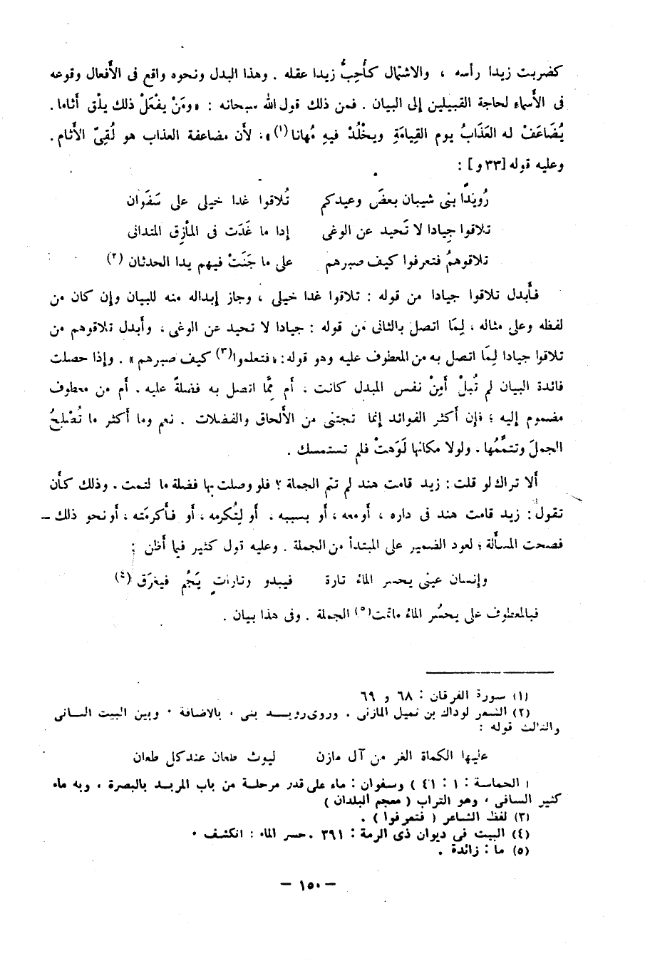 كضربت زيدًا رأسه، والاشمال كأُحب زيدًا عقله. وهذا البدل ونحوه واقع في الأفعال وقوعه في الأسماء لحاجة القبيلين إلى البيان، فمن ذلك قول الله سبحانه: {وَمَنْ يَفْعَلْ ذَلِكَ يَلْقَ أَثَامًا، يُضَاعَفْ لَهُ الْعَذَابُ يَوْمَ الْقِيَامَةِ وَيَخْلُدْ فِيهِ مُهَانًا} 1؛ لأن مضاعفة العذاب هو لُقِيُّ الأثام، وعله قوله "33و":
