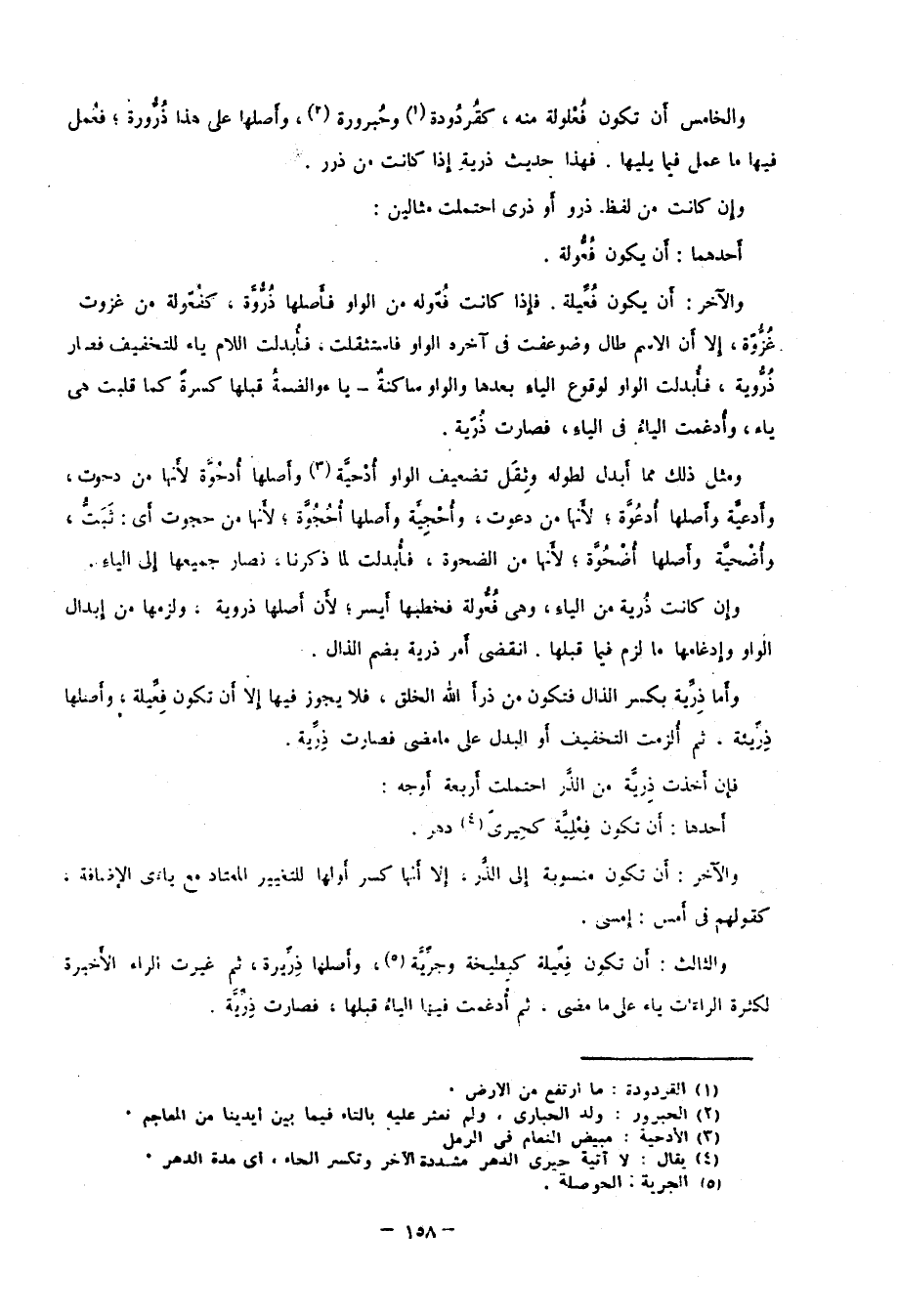 والخامس: أن تكون فُعْلولة منه؛ كقُرْدودة1 وحُبْرورة2، وأصلها على هذا ذُرُّورة؛ فعُمل فيها ما عمل فيما يليها، فهذا حديث ذرية إذا كانت من ذرر.