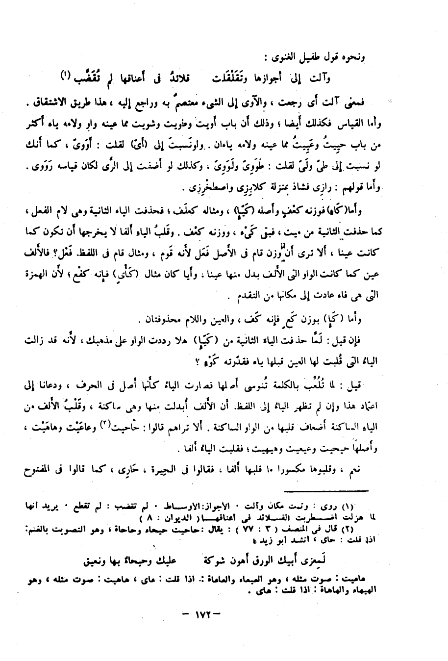 وأما "كَاءٍ" فوزنه كعف وأصله "كَيَّأٍ"، ومثاله كعلَف، فحذفت الياء الثانية وهي لام الفعل، كما حذفت الثانية من ميت، فبقي كَيْء، ووزنه كَعْف، وقَلْبُ الياء ألفًا لا يخرجها أن تكون كما كانت عينًا، ألا ترى أن وزن قام في الأصل فعل لأنه قوم، ومثال قام في اللفظ فَعْل؟ فالألف عين كما كانت الواو التي الألف بدل منها عينًا، وأيًّا كان مثال "كأي" فإنه كفع؛ لأن الهمزة التي هي فاء عادت إلى مكانها من التقدم.