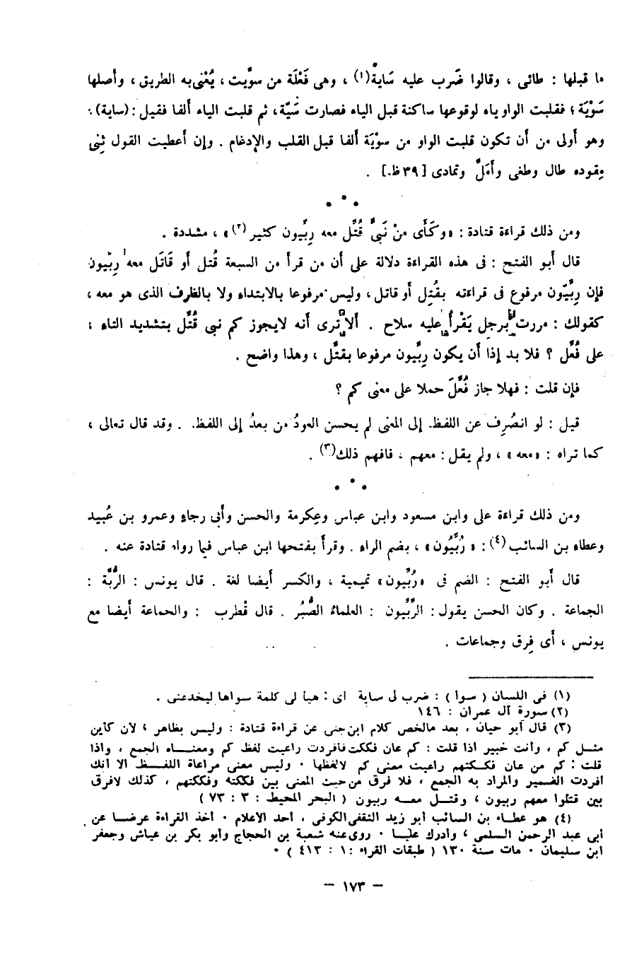 ومن ذلك قراءة علي وابن مسعود وابن عباس وعكرمة والحسن وأبي رجاء وعمرو بن عبيد وعطاء بن السائب4: "رُبِّيون" بضم الراء، وقرأ بفتحها ابن عباس فيما رواه قتاده عنه.
