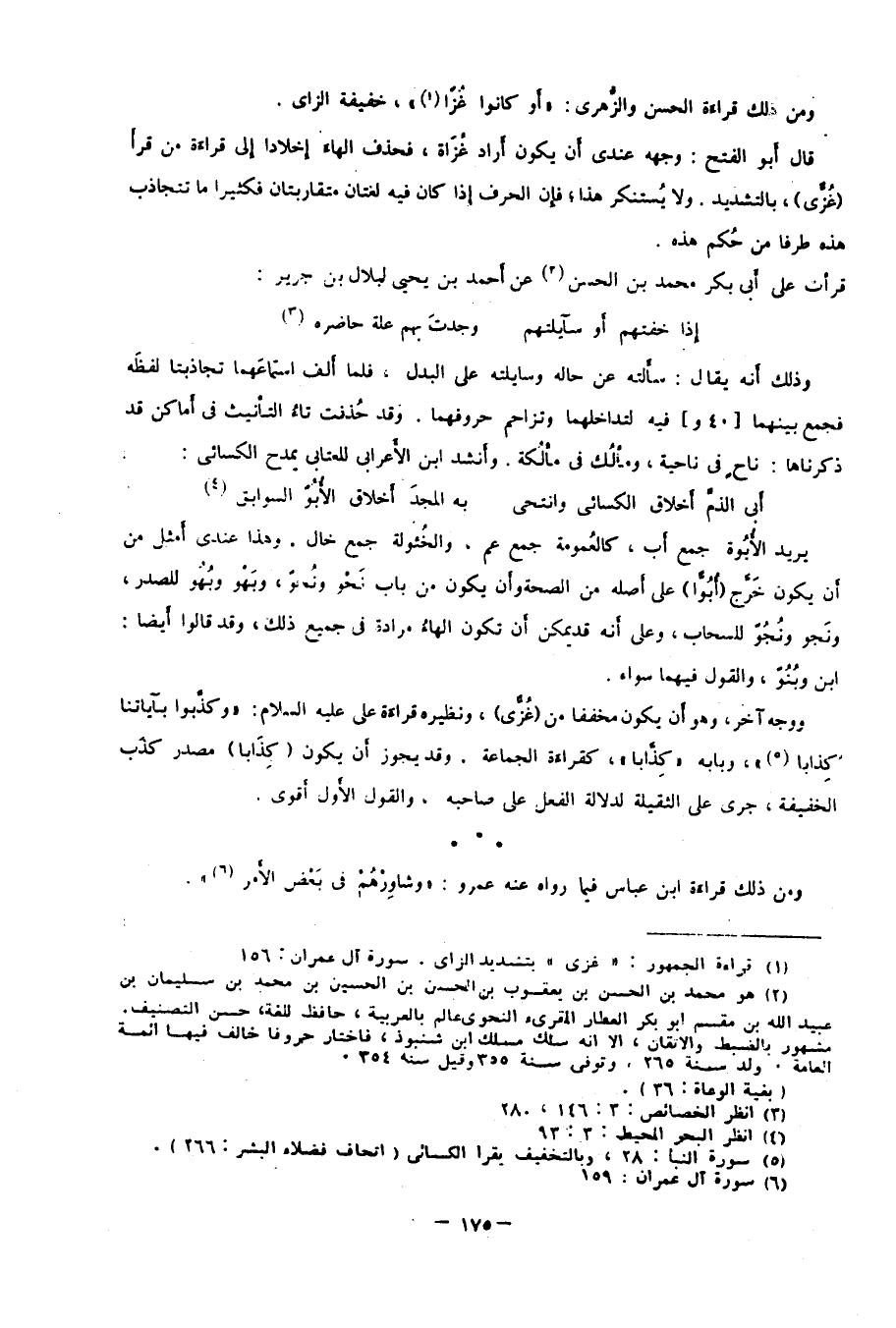 ووجه آخر؛ وهو أن يكون مخففًا من "غُزًّى"، ونظيره قراءة علي عليه السلام: "وَكَذَّبُوا بِآياتِنَا كِذَابًا"5، وبابه "كذَّابًا" كقراءة الجماعة. وقد يجوز أن يكون "كِذَابًا" مصدر كذَب الخفيفة، جرى على الثقيلة لدلالة الفعل على صاحبه، والقول الأول أقوى.