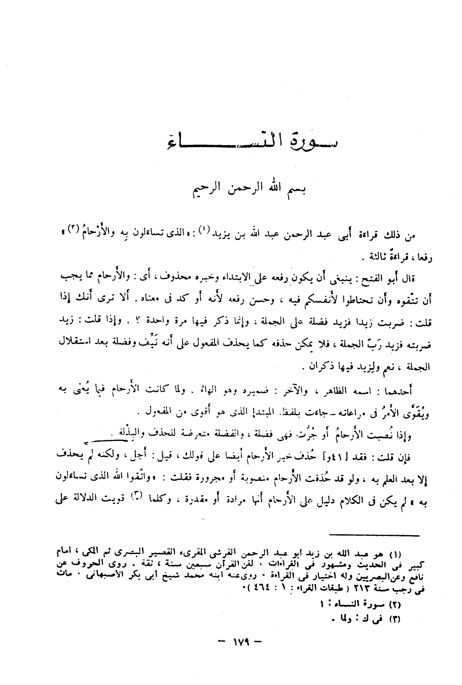 قال أبو الفتح: ينبغي أن يكون رفعه على الابتداء وخبره محذوف؛ أي: والأرحام مما يجب أن تتقوه، وأن تحتاطوا لأنفسكم فيه، وحسن رفعه لأنه أوكد في معناه، ألا ترى أنك إذا قلت: ضربت زيدًا، فزيد فضلة على الجملة، وإنما ذكر فيه مرة واحدة، وإذا قلت: زيد ضربته، فزيد رب الجملة، فلا يمكن حذفه كما يحذف المفعول على أنه نيِّف وفضلة بعد استقلال الجملة؟ نعم، ولزيد فيها ذكران: