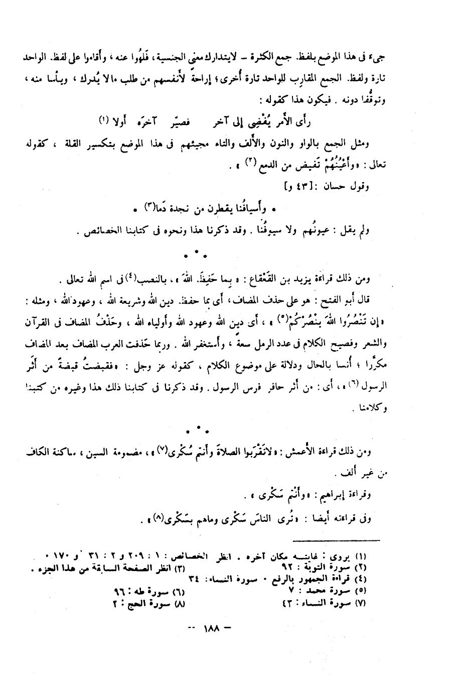 ومن ذلك قراءة الأعمش: "لا تَقْرَبُوا الصَّلاةَ وَأَنْتُمْ سُكْرَى"7 مضمومة السين، ساكنة الكاف من غير ألف.