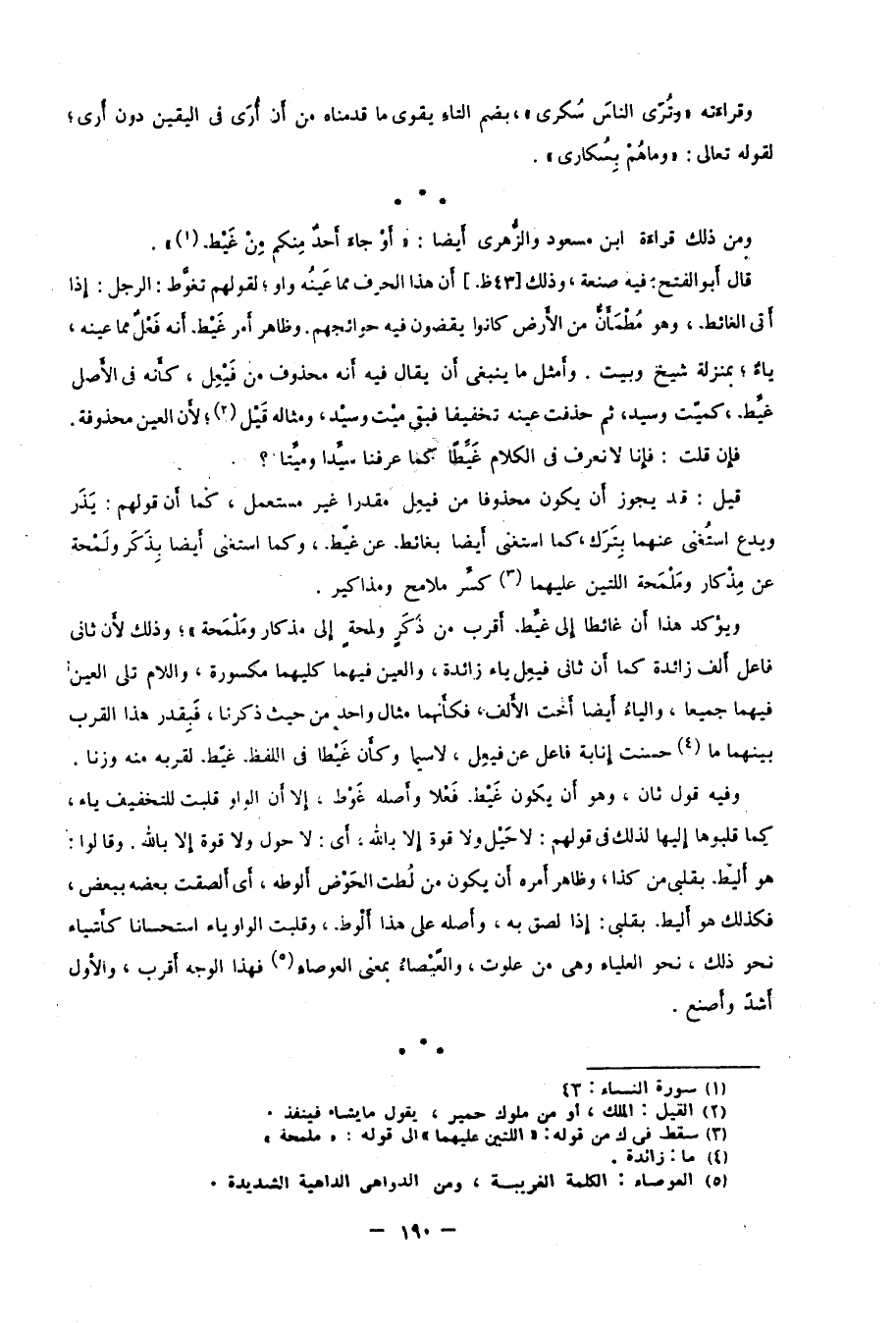 وفيه قول ثانٍ؛ وهو أن يكون غَيْط فَعْلًا وأصله غَوْط، إلا أن الواو قلبت للتخفيف ياء، كما قلبوها إليها لذلك في قولهم: لا حَيْل ولا قوة إلا بالله؛ أي: لا حول ولا قوة إلا بالله. وقالوا: هو أَليط بقلبي من كذا، وظاهر أمره أن يكون من لُطت الحوض أَلوطه؛ أي: ألصقت بعضه ببعض، فكذلك هو أَليط بقلبي: إذا لصق به، وأصله على هذا أَلْوط، وقلبت الواو ياء استحسانًا كأشياء نحو ذلك، نحو: العلياء وهي من علوت، والعَيْصاء بمعنى العوصاء5، فهذا الوجه أقرب، والأول أشد وأصنع.