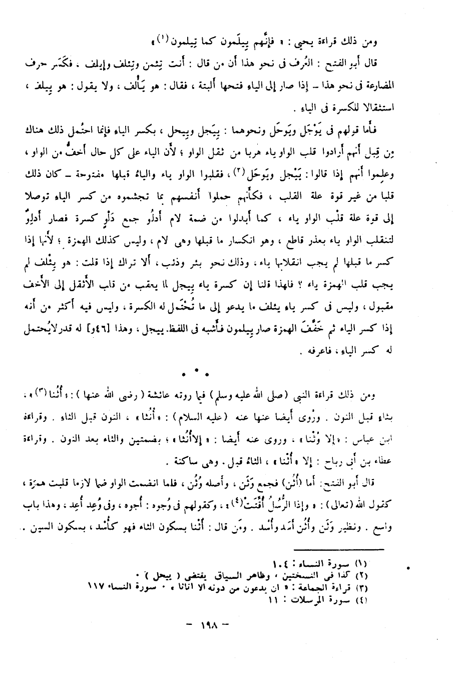 فأما قولهم في يَوْجَل ويَوْحَل ونحوهما: يِيجل ويِيحل بكسر الياء، فإنما احتُمل ذلك هناك من قِبَلِ أنهم أرادا قلب الواو ياء هربًا من ثقل الواو؛ لأن لياء على كل حال أخف من الواو، وعلموا أنهم إذا قالوا: يَيْجل ويَوحَل2، فقلبوا الواو ياء والياء قبلها مفتوحة كان ذلك قلبًا من غير قوة علة القلب، فكأنهم حملوا أنفسهم بما تجشموه من كسر الياء توصلًا إلى قوة علة قلب الواو ياء، كما أبدلوا من ضمة لام أَدلُو جمع دَلْوٍ كسرة فصار أَدلِوٌ لتنقلب الواو ياء بعذر قاطع؛ وهو انكسار ما قبلها وهي لام، وليس كذلك الهمزة؛ لأنها إذا كسر ما قبلها لم يجب انقلابها ياء، وذلك نحو: بئر وذئب، ألا تراك إذا قلت: هو يِئْلف، لم يجب قلب الهمزة ياء؟ فلهذا قلنا: إن كسرة ياء يِيجل لما يعقب من قلب الأثقل إلى الأخف مقبول، وليس في كسر ياء يئلف ما يدعو إلى ما تُحْتَمل له الكسرة، وليس فيه أكثر من أنه إذا كسر الياء ثم خفَّف الهمزة صار يِيلمون فأشبه في اللفظ ييجل، وهذا "46و" له قدر لا يُحتمل له كسر الياء، فاعرفه.