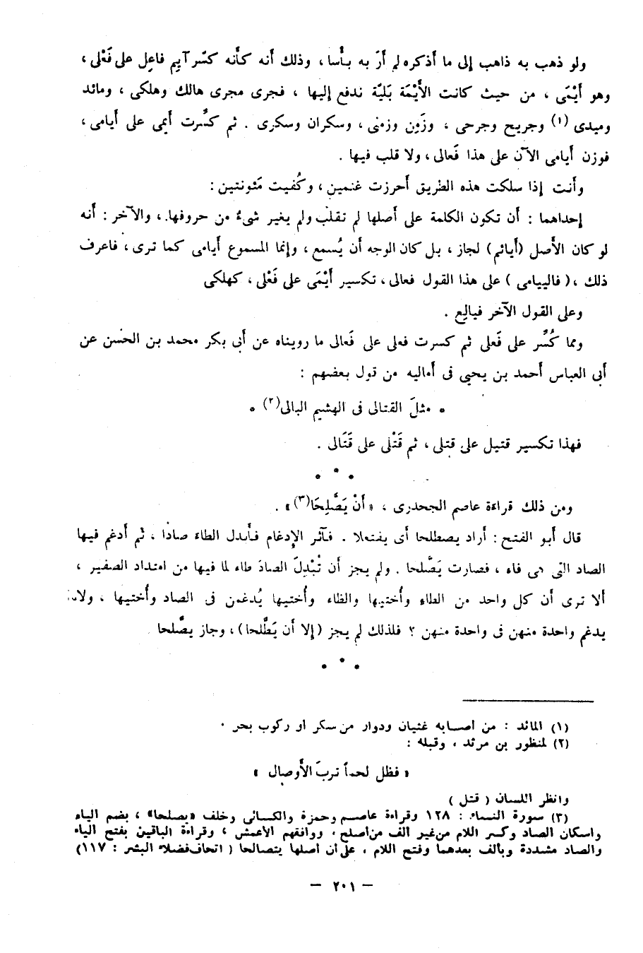 قال أبو الفتح: أراد: يصطلحا أي يفتعلا، فآثر الإدغام فأبدل الطاء صادًا، ثم أدغم فيها الصاد التي هي فاء، فصارت يصَّلحا، ولم يجز أن تبدل الصاد طاء لما فيها من امتداد الصفير، ألا ترى أن كل واحد من الطاء وأختيها والظاء وأختيها يُدغمن في الصاد وأختيها، ولا يدغم واحدة منهن في واحدة منهن؟ فلذلك لم يجز "إلا أن يَطَّلحا"، وجاز "يصَّلحا".