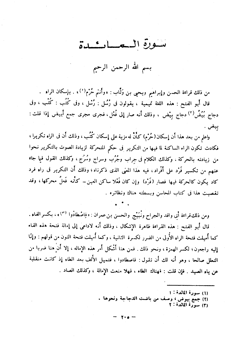 واعلم من بعد هذا أن إسكان "حُرْم" كأن له مزية على إسكان كُتُب؛ وذلك أن في الراء تكريرًا، فكادت تكون الراء الساكنة لما فيها من التكرير في حكم المتحركة لزيادة الصوت بالتكرير نحوًا من زيادته بالحركة، وكذلك الكلام في جِراب وجُرُب وسِراج وسُرُج، وكذلك القول فيما جاء عنهم من تكسير فرد على أفراد، فيه هذا المعنى الذي ذكرناه؛ وذلك أن التكرير في راء فرد كاد يكون كالحركة فيها فصار "فَرْد" وإن كان فَعْلًا ساكن العين، كأنه فَعْلٌ محركها، وقد تقصيت في هذا كتاب المحاسن وبسطته هناك ونظائره.