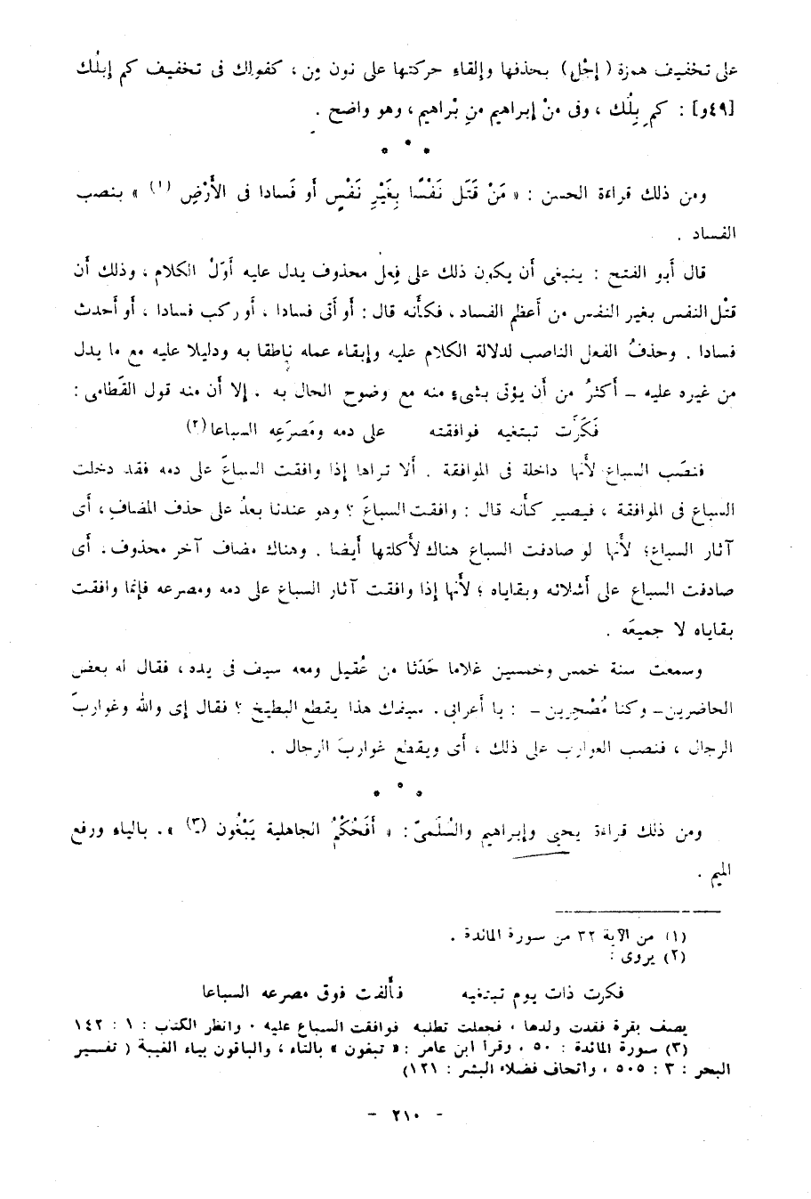 قال أبو الفتح: ينبغي أن يكون ذلك على فعل محذوف يدل عليه أول الكلام؛ وذلك أن قتل النفس بغير النفس من أعظم الفساد، فكأنه قال: قال أو أتى فسادًا، أو ركب فسادًا، أو أحدث فسادًا. وحذفُ الفعل الناصب لدلالة الكلام عليه وإبقاء علمه ناطقًا به ودليلًا عليه مع ما يدل من غيره عليه -أكثرُ من أن يؤتى بشيء منه مع وضوح الحال به، إلا أن منه قول القطامي: