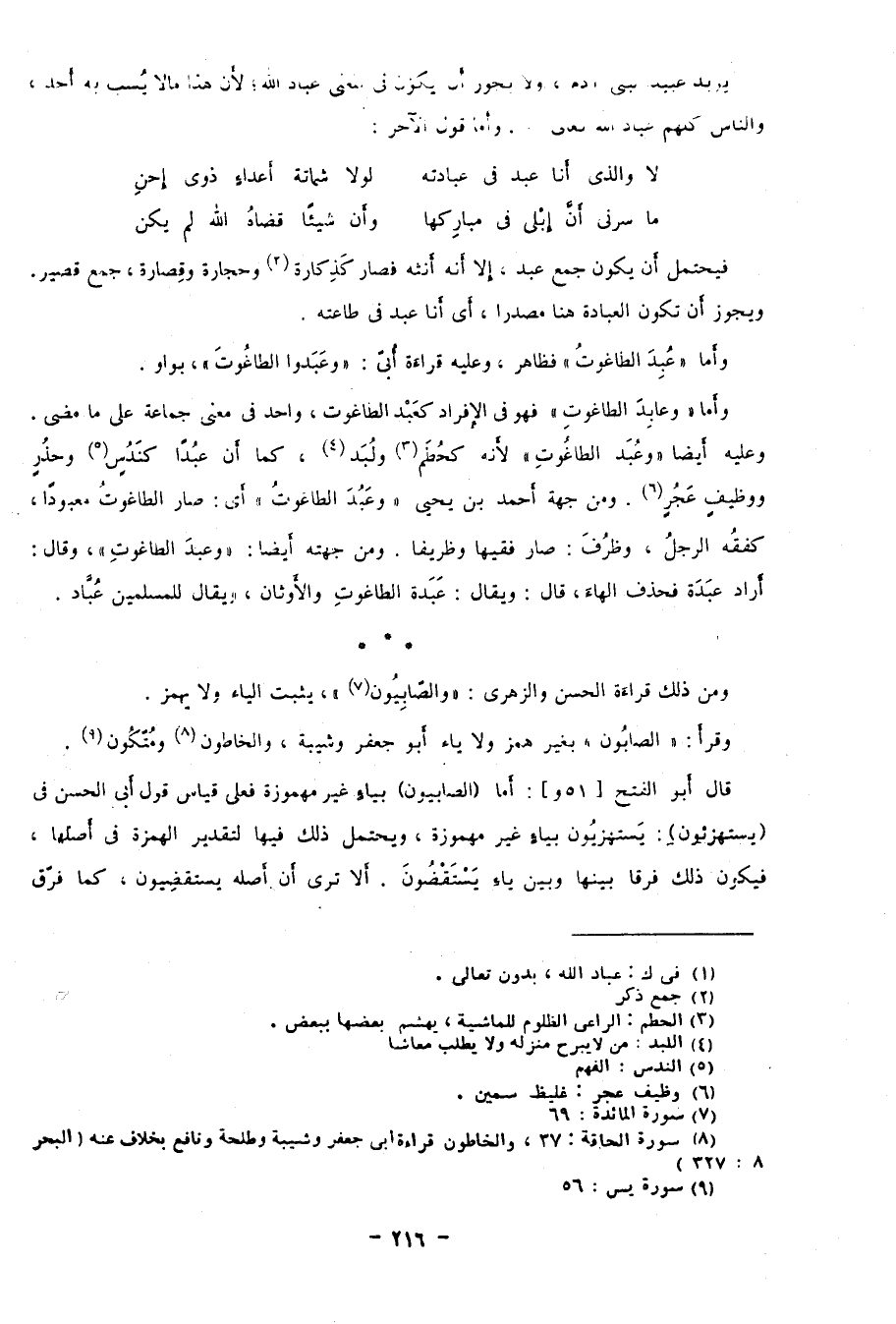 وأما "وعابِدَ الطاغوتِ" فهو في الإفراد كعبد الطاغوت، واحد في معنى جماعة على ما مضى. وعليه أيضًا: "وعُبَد الطاغوتِ" لأنه كحُطَم3 ولُبَد4، كما أن عبُدًا كندُسٍ5 وحذُرٍ ووظيف عَجُرٍ6، ومن جهة أحمد بن يحيى "وعَبُدَ الطاغوتُ" أي: صار الطاغوتُ معبودًا؛ كفقُه الرجل وظرف: صار فقيهًا وظريفًا، ومن جهته أيضًا: "وعبدَ الطاغوتِ" وقال: أراد عبَدَة فحذف الهاء، قال: ويقال: عَبَدة الطاغوتِ والأوثان، ويقال للمسلمين: عُبَّاد.