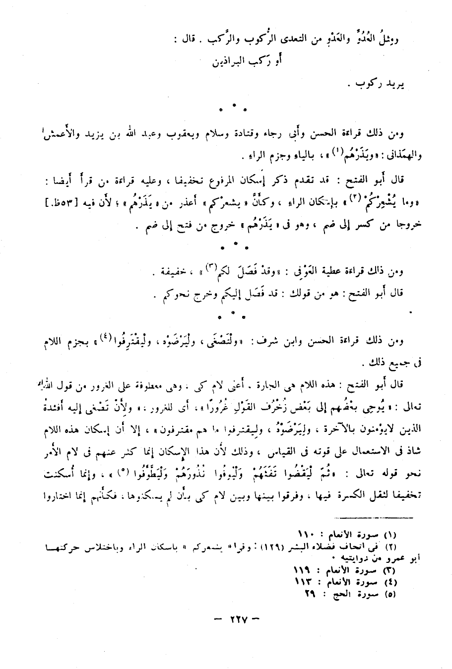 قال أبو الفتح: قد تقدم ذكر إسكان المرفوع تخفيفًا، وعليه قراءة مَن قرأ أيضًا: "وَمَا يُشْعِرْكُم"2 بإسكان الراء، وكأن "يشعرْكم" أعذر من "يَذَرْهُم"؛ لأن فيه "53ظ" خروجًا من كسر إلى ضم، وهو في "يَذَرْهُم" خروج من فتح إلى ضم.