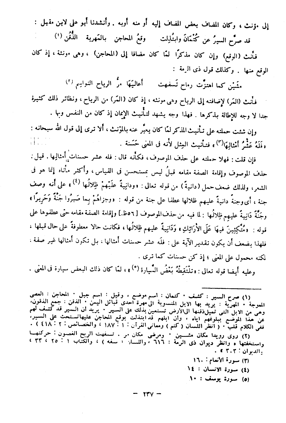 فإن قلت: فهلَّا حملته على حذف الموصوف، فكأنه قال: فله عشر حسنات أمثالها، قيل: حذف الموصوف وإقامة الصفة مقامه قبلُ ليس بمستحسن في القياس، وأكثر مأتاه إنما هو في الشعر؛ ولذلك ضعف حمل "دانيةً" من قوله: {وَدَانِيَةً عَلَيْهِمْ ظِلالُهَا} 4 على أنه وصف جنة؛ أي: وجنةً دانيةً عليهم ظلالها، عطفًا على جنة من قوله: {وَجَزَاهُمْ بِمَا صَبَرُوا جَنَّةً وَحَرِيرًا} وجَنةً دَانِيَةً عَلَيْهِمْ ظِلالُهَا؛ لما فيه من حذف الموصوف "56ظ" وإقامة الصفة مقامه حتى عطفوها على قوله: {مُتَّكِئِينَ فِيهَا عَلَى الْأَرَائِكِ} ودانيةً عليهم ظلالها، فكانت حالًا معطوفة على حال قبلها، فلهذا يضعف أن يكون تقدير الآية على: فله عشر حسنات أمثالها؛ بل تكون أمثالها غير صفة لكنه محمول على المعنى؛ إذ كن حسنات كما ترى.