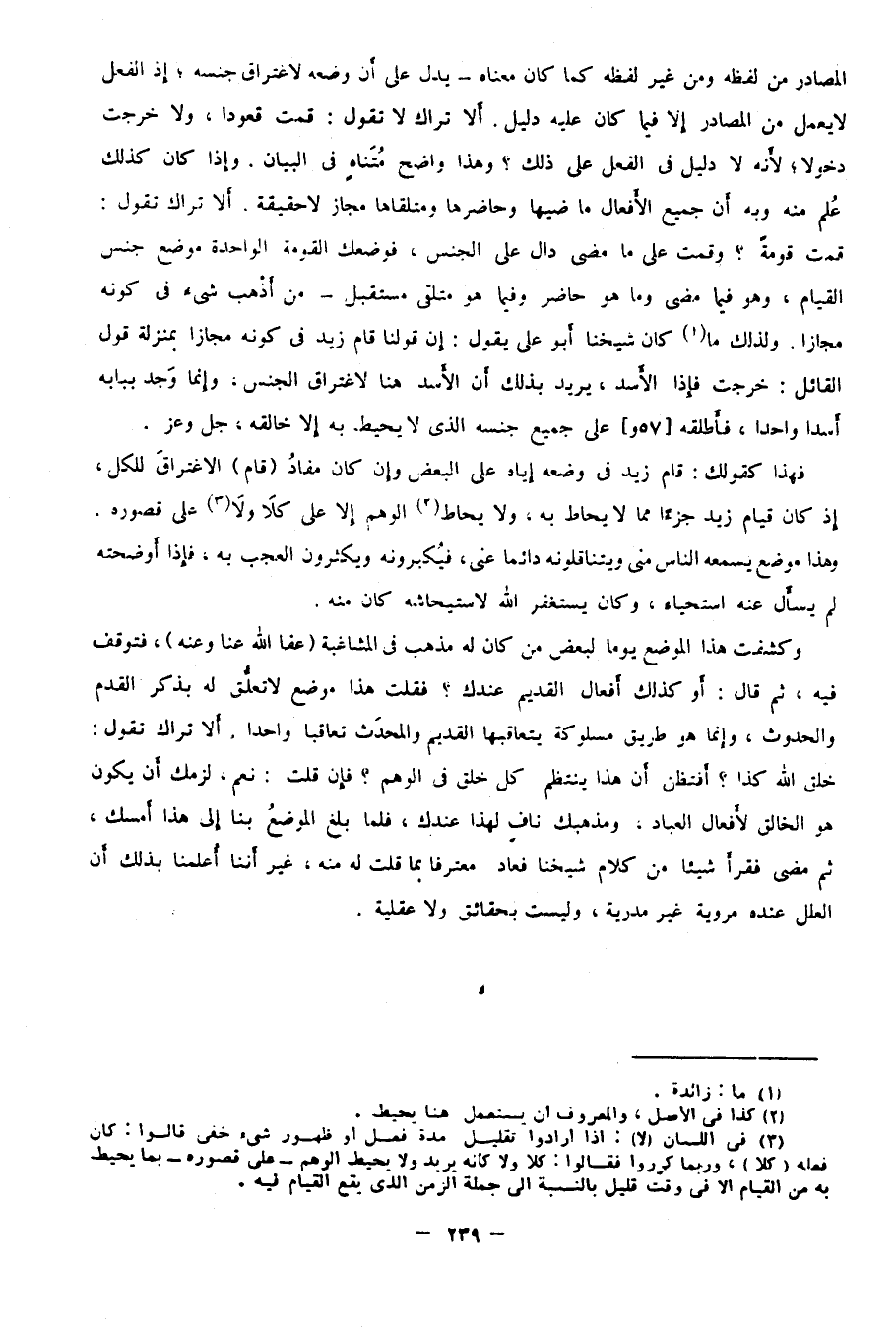 وكشفت هذا الموضع يومًا لبعض من كان له مذهب في المشاغبة -عفا الله عنا وعنه- فتوقف فيه، ثم قال: أوكذلك أفعال القديم عندك؟ فقلت: هذا موضع لا تعلُّق له بذكر القدم والحدوث؛ وإنما هو طريق مسلوكة يتعاقبها القديم والمحدَث تعاقبًا واحدًا، ألا تراك تقول: خلق الله كذا؟ أفتظن أن هذا ينتظم كل خلق في الوهم؟ فإن قلت: نعم، لزمك أن يكون هو الخالق لأفعال العباد، ومذهبك نافٍ لهذا عندك، فلما بلغ الموضعُ بنا إلى هذا أَمسك، ثم مضى فقرأ شيئًا من كلام شيخنا فعاد معترفًا بما قلت له منه، غير أننا أُعلمنا بذلك أن العلل عنده مروية غير مدرية، وليست بحقائق ولا عقلية.