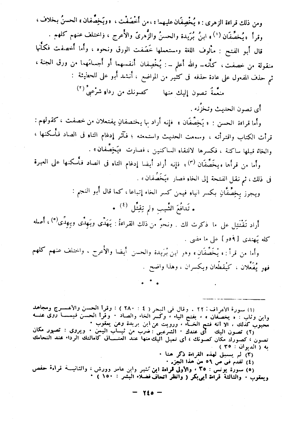 وأما من قرأها "يَخَصِّفان"3، فإنه أراد أيضًا إدغام التاء في الصاد فأسكنها على العبرة في ذلك، ثم نقل الفتحة إلى الخاء؛ فصار "يَخَصِّفان".
