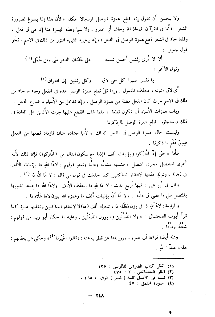 ولا يحسن أن تقول: إنه قطع همزة الوصل ارتجالًا هكذا؛ لأن هذا إنما يسوغ لضرورة الشعر. فأما في القرآن فمعاذ الله وحاشا أبي عمرو، ولا سيما وهذه الهمزة هنا إنما هي في فعل، وقلما جاء في الشعر قطع همزة الوصل في الفعل؛ وإنما يجيء الشيء النزر من ذلك في الاسم، نحو قول جميل: