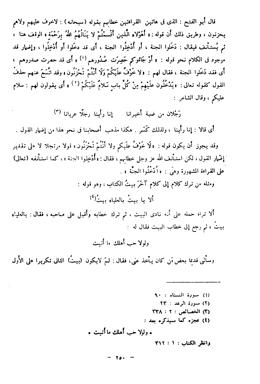 قال أبو الفتح: الذي في هاتين القراءتين خطابهم بقوله سبحانه: "لا خوف عليهم ولا هم يحزنون"، وطريق ذلك أن قوله: "أَهَؤُلاءِ الَّذِينَ أَقْسَمْتُمْ لا يَنَالُهُمُ اللَّهُ بِرَحْمَةٍ" الوقف هنا، ثم يُستأنف فيقال: "دَخَلُوا الجنة"، أو "أُدْخِلُوا الجنة" أي: قد دخَلوا أو أُدخلوا، وإضمار قد موجود في الكلام نحو قوله: {أَوْ جَاءُوكُمْ حَصِرَتْ صُدُورُهُمْ} 1 أي: قد حصرت صدورهم؛ أي: فقد دخلوا الجنة، فقال لهم: {لا خَوْفٌ عَلَيْكُمْ وَلا أَنْتُمْ تَحْزَنُونَ} ، وقد اتسع عنهم حذف القول كقوله تعالى: {يَدْخُلُونَ عَلَيْهِمْ مِنْ كُلِّ بَابٍ، سَلامٌ عَلَيْكُمْ} 2 أي: يقولون لهم: سلام عليكم، وقال الشاعر: