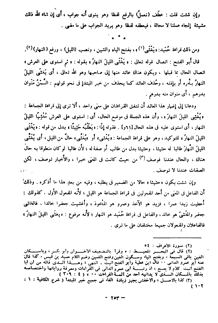 ودعانا إلى إضمار هذا العائد أن تتفق القراءتان على معنى واحد؛ ألا ترى إلى قراءة الجماعة: {يُغْشِي اللَّيْلَ النَّهَارَ} ، وأن هذه الجملة في موضع الحال؛ أي: استوى على العرش مُغْشِيًا الليل النهار؛ أي: استوى عليه في هذه الحال "61و".