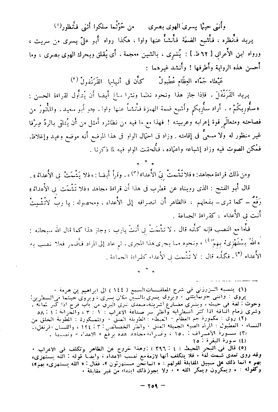 يريد: القَرَنْفُل، فإذا جاز هذا ونحوه نظمًا ونثرًا ساغ أيضًا أن يُتأول لقراءة الحسن: "سأُورِيكُمْ"، أراد: سأُرِيكم وأشبع ضمة الهمزة فأنشأ عنها واوًا، وهو أبو سعيد، والمأثور من فصاحته ومتعالَم قوة إعرابه وعربيته! فهذا مع ما فيه من نظائره أمثل من أن يُتلقي بالرد صِرفًا غير منظور له ولا مسعيٍّ في إقامته. وزاد في احتمال الواو في هذا الموضع أنه موضع وعيد وإغلاظ، فمُكن الصوت فيه وزاد إشباعه واعتماده، فأُلحقت الواو فيه لما ذكرنا.