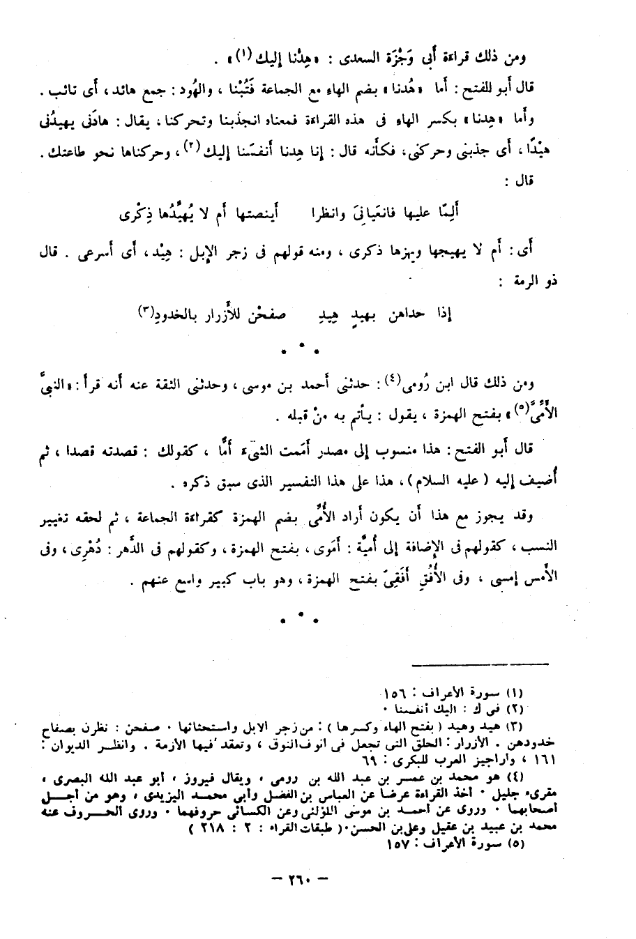 ومن ذلك قال ابن رومي4: حدثني أحمد بن موسى، وحدثني الثقة عنه أنه قرأ: "النَّبِيَّ الْأَمِّيَّ"5 بفتح الهمزة، يقول: يأْتم به مَنْ قبله.