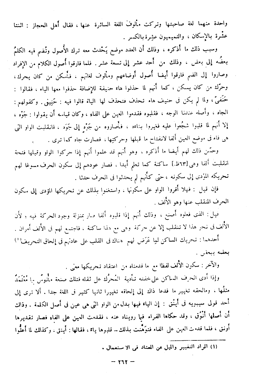 وسبب ذلك ما أذكره؛ وذلك أن العدد موضع يَحْدث معه ترك الأصول، وتُضم فيه الكلم بعضه إلى بعض، وذلك من أحد عشر إلى تسعة عشرة، فلما فارقوا أصول الكلام من الإفراد وصاروا إلى الضم فارقوا أيضًا أصول أوضاعهم ومألوف لغاتهم، فأسكن من كان يحرك، وحرك من كان يسكن، كما أنهم لما حذفوا هاء حنيفة للإضافة حذفوا معها الياء، فقالوا: حنفي، ولما لم يكن في حنيف هاء تحذف فتحذف لها الياء قالوا فيه: حنيفي، كقولهم: الجاه، وأصله عندنا الوجه، فقلبوه فقدموا العين على الفاء، وكان قياسه أن يقولوا: جَوْه، إلا أنهم لما قلبوا شجُعوا عليه فغيروا بناءه. فأصاروه من جَوْه إلى جَوَه، فانقلبت الواو التي هي فاء في موضع العين ألفًا لانفتاح ما قبلها وحركتها، فصارت جاه كما ترى.