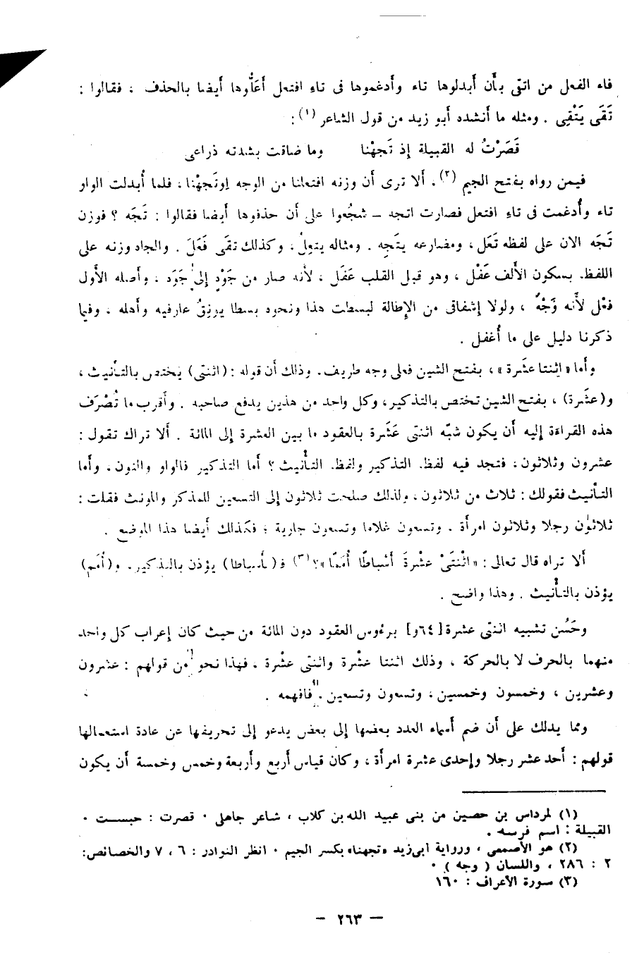 وأما "اثنتا عشَرة" بفتح الشين فعلى وجه طريف؛ وذلك أن قوله: "اثنتي" يختص بالتأنيث، و"عشَرة" بفتح الشين تختص بالتذكير، وكل واحد من هذين يدفع صاحبه. وأقرب ما تُصرف هذه القراءة إليه أن يكون شبَّه اثنتي عَشَرة بالعقود ما بين العشرة إلى المائة، ألا تراك تقول: عشرون وثلاثون، فتجد فيه لفظ التذكير ولفظ التأنيث؟ أما التذكير فالواو والنون، وأما التأنيث فقولك: ثلاث من ثلاثون؛ ولذلك صلحت ثلاثون إلى التسعين للمذكر والمونث فقلت: ثلاثون رجلًا وثلاثون امرأة، وتسعون غلامًا وتسعون جارية، فكذلك أيضًا هذا الموضع.