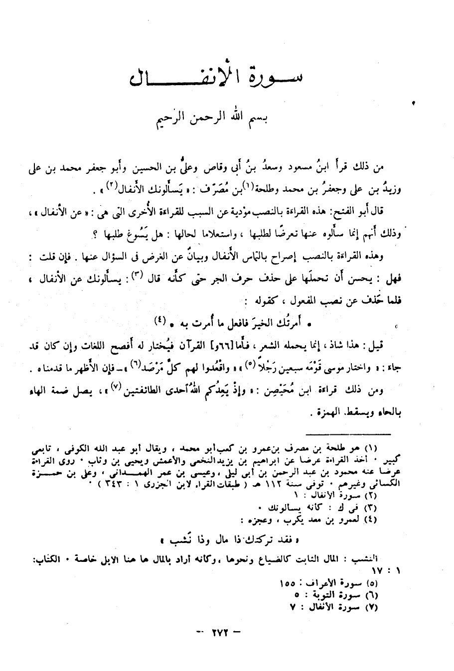 من ذلك قرأ ابن مسعود وسعد بن أبي وقاص وعلي بن الحسين وأبو جعفر محمد بن علي وزيد بن علي وجعفر بن محمد وطلحة1 بن مصرف: "يَسأَلونك الأَنْفَالَ"2.