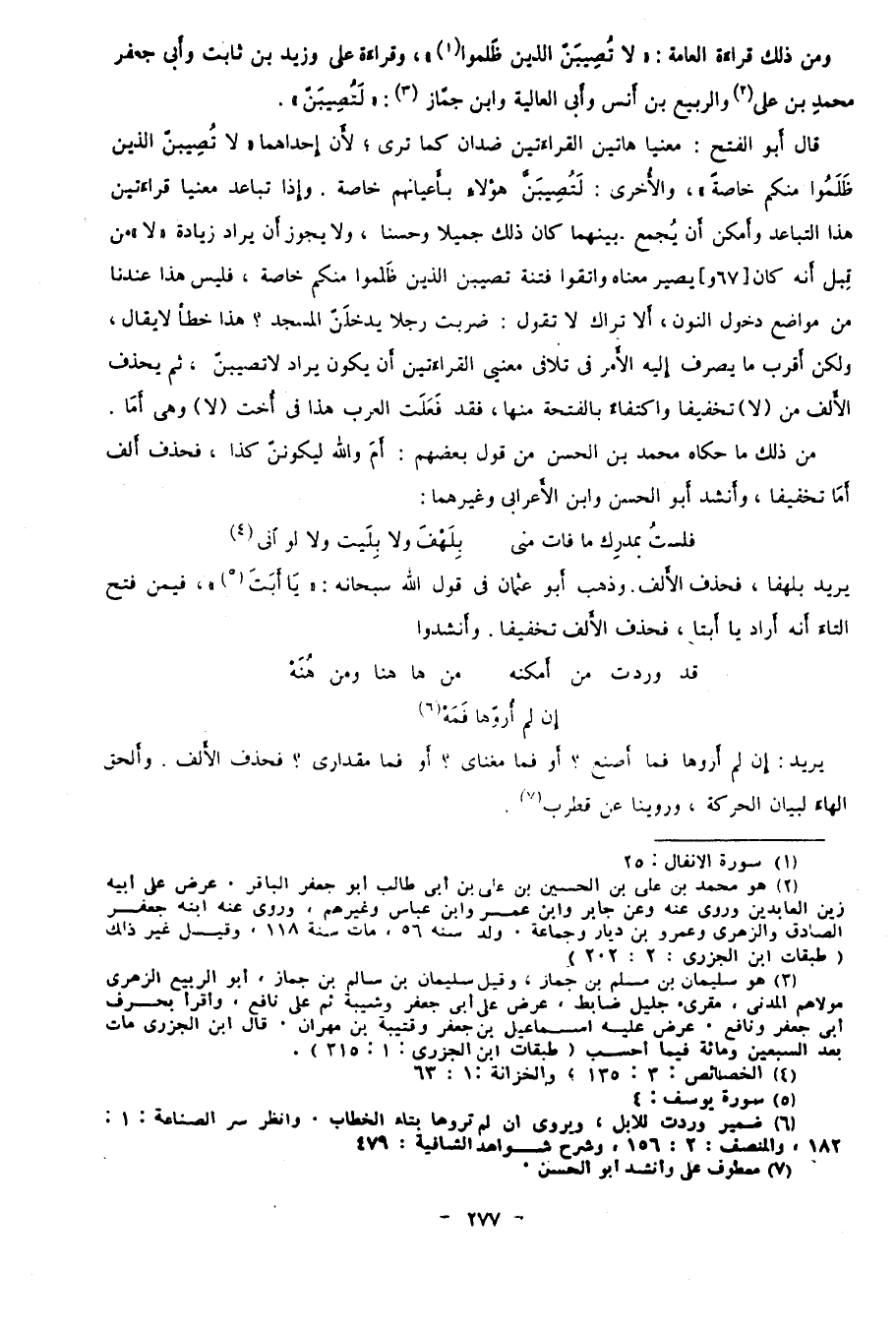 قال أبو الفتح: معنيا هاتين القراءتين ضدان كما ترى؛ لأن إحداهما: {لَا تُصِيبَنَّ الَّذِينَ ظَلَمُوا مِنْكُمْ خَاصَّةً} ، والأخرى: "لَتُصِيبَنَّ" هؤلاء بأعيانهم خاصة. وإذا تباعد معنيا قراءتين هذا التباعد وأمكن أن يُجمع بينهما كان ذلك جميلًا وحسنًا، ولا يجوز أن يراد زيادة "لا" من قِبَل أنه كان "67و" يصير معناه: واتقوا فتنة تصيبن الذين ظلموا منكم خاصة، فليس هذا عندنا من مواضع دخول النون، ألا تراك لا تقول: ضربت رجلًا يدخلَنَّ المسجد؟ هذا خطأ لا يقال؛ ولكن أقرب ما يصرف إليه الأمر في تلافي معنى القراءتين أن يكون يراد: لا تصيبن، ثم يحذف الألف من "لا" تخفيفًا واكتفاء بالفتحة منها، فقد فَعَلَت العرب هذا في أخت "لا" وهي أَمَا.