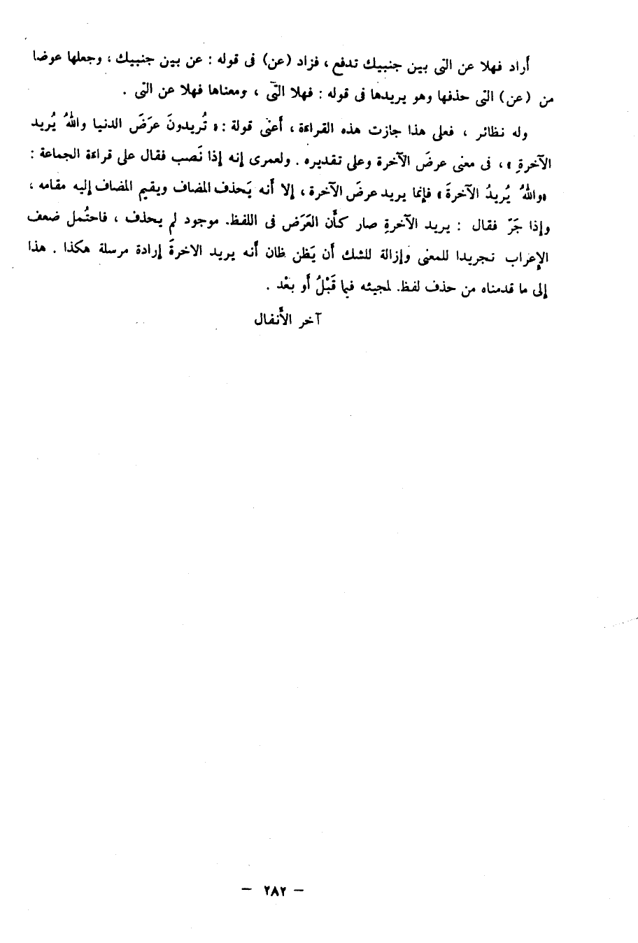 وله نظائر، فعلى هذا جازت هذه القراءة؛ أعني قوله: "تُرِيدُونَ عَرَضَ الدُّنْيَا وَاللَّهُ يُرِيدُ الْآخِرَةِ"، في معنى: عرض الآخرة وعلى تقديره. ولعمري إنه إذا نصب فقال على قراءة الجماعة: {وَاللَّهُ يُرِيدُ الْآخِرَةَ} ، فإنما يريد: عرض الآخرة، إلا أنه يَحذف المضاف ويقيم المضاف إليه مقامه، وإذا جَرَّ فقال: يريد الآخرةِ، صار كأن العَرَض في اللفظ موجود لم يحذف، فاحتُمل ضعف الإعراب تجريدًا للمعنى وإزالة للشك أن يَظن ظان أنه يريد الآخرةَ إرادة مرسلة هكذا. هذا إلى ما قدمناه من حذف لفظ لمجيئه فيما قَبْلُ أو بَعْدُ.