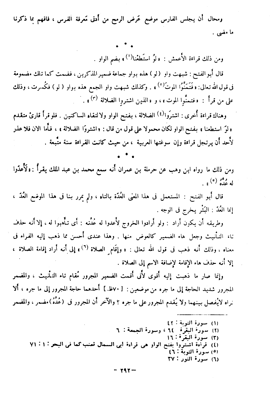 وهناك قراءة أخرى: "اشتروَا4 الضلالة" بفتح الواو لالتقاء الساكنين، فلو قرأ قارئ متقدم: "لوَ استطعنا" بفتح الواو لكان محمولًا على قول من قال: "اشْتَرَوَا الضَّلالَةَ"، فأما الآن فلا عذر لأحد أن يرتجل قراءة وإن سوغتها العربية، من حيث كانت القراءة سُنة متَّبعة.