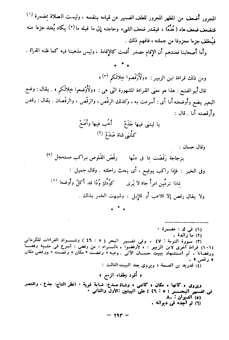 3 سورة التوبة: 47، وفي تفسير البحر 5/ 49، وشواذ القراءات للكرماني 101، قراءة أخرى لابن الزبير: "لأرفضوا" بالراء، من رفض: أسرع في مشيه رفضًا ورفضانًا، ثم استشهاد ببيت حسان الآتي: وفيه "رفضت" مكان "رقصت"، و"رفض" مكان "رقص".