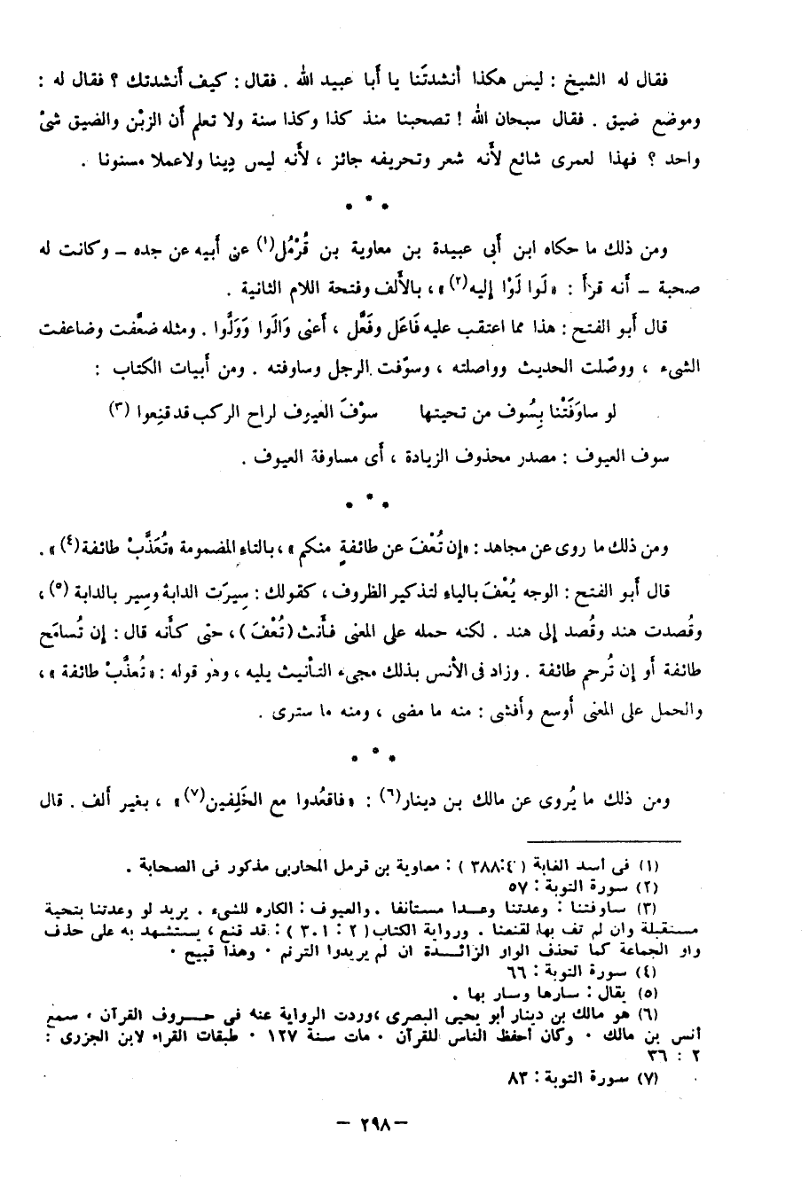 فقال له الشيخ: ليس هكذا أنشدتنا يا أبا عبيد الله، فقال: كيف أنشدتك؟ فقال له: وموضع ضيق، فقال: سبحان الله! تصحبنا منذ كذا وكذا سنة ولا تعلم أن الزبْن والضيق شيء واحد؟ فهذا لعمري شائع؛ لأنه شعر وتحريفه جائز؛ لأنه ليس دِينًا ولا عملًا مسنونًا.