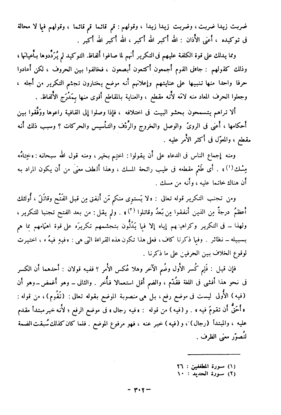 ومن تجنب التكرير قوله تعالى: {لا يَسْتَوِي مِنْكُمْ مَنْ أَنْفَقَ مِنْ قَبْلِ الْفَتْحِ وَقَاتَلَ أُولَئِكَ أَعْظَمُ دَرَجَةً مِنَ الَّذِينَ أَنْفَقُوا مِنْ بَعْدُ وَقَاتَلُوا} 2، ولم يقل: من بعد الفتح؛ تجنبًا للتكرير؛ ولهذا -في التكرير وكراهيتهم إياه إلا فيما يدُلُّون بتجشمهم تكريره على قوة اهتمامهم بما هم بسبيله- نظائر، وفيما ذكرنا كافٍ، فعلى هذا تكون هذه القراءة التي هي: "فيهِ فيهُ" اختيرت لوقوع الخلاف بين الحرفين على ما ذكرنا.