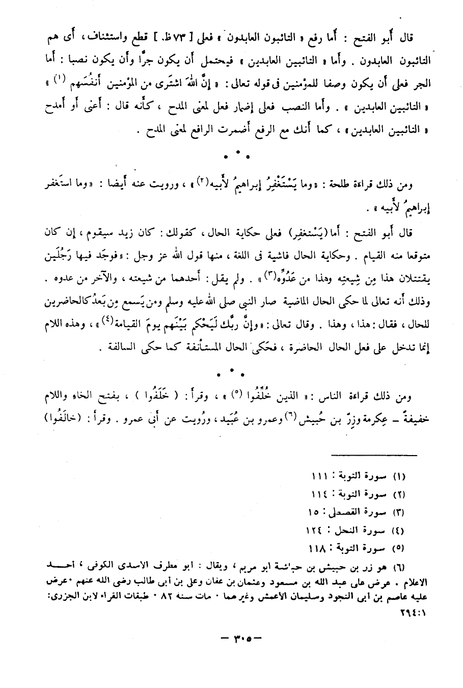 6 هو زر بن حبيش بن حباشة أبو مريم، ويقال: أبو مطرف الأسدي الكوفي، أحد الأعلام. عرض على عبد الله بن مسعود وعثمان بن عفان وعلي بن أبي طالب رضي الله عنهم. عرض عليه عاصم بن أبي النجود وسليمان الأعمش وغيرهما. مات سنة 82. طبقات القراء لابن الجزري: 1/ 294.