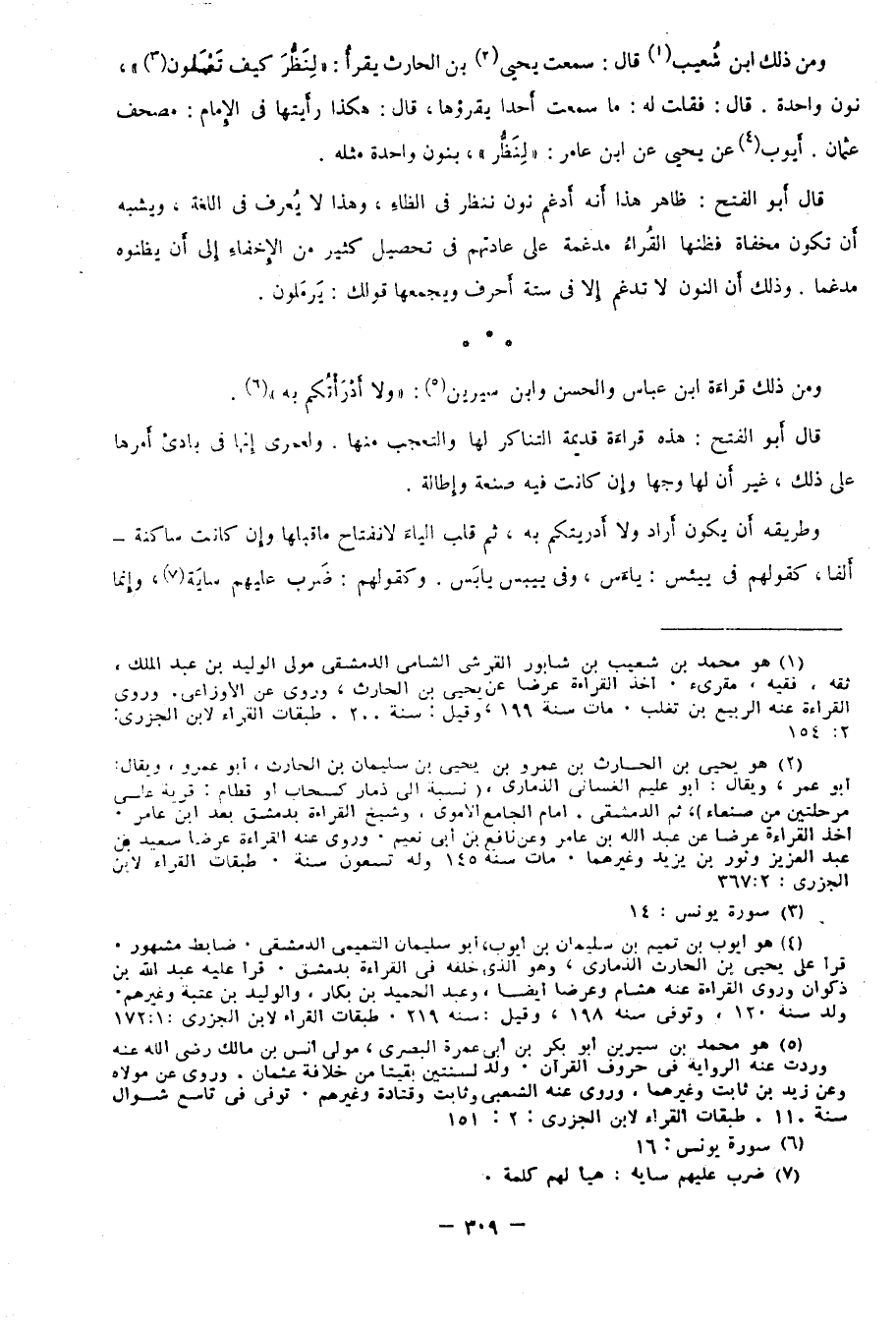 ومن ذلك ابن شعيب1 قال: سمعت يحيى2 بن الحارث يقرأ: "لِنَظُّرَ كيف تَعْمَلون"3 بنون واحدة. قال: فقلت له: ما سمعت أحدًا يقرؤها، قال: هكذا رأيتها في الإمام: مصحف عثمان. أيوب4 عن يحيى عن ابن عامر: "لِنَظُّرَ" بنون واحدة مثله.