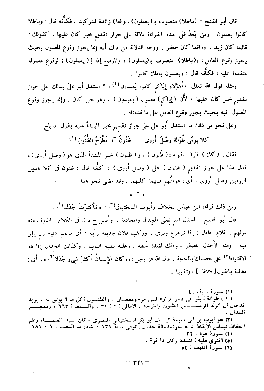 قال أبو الفتح: "باطلًا" منصوب بـ"يعملون"، "ما" زائدة للتوكيد؛ فكأنه قال: وباطلًا كانوا يعملون. ومن بعد ففي هذه القراءة دلالة على جواز تقديم خبر كان عليها؛ كقولك: قائمًا كان زيد، وواقفًا كان جعفر. ووجه الدلالة من ذلك أنه إنما يجوز وقوع المعمول بحيث يجوز وقوع العامل، و"باطلًا" منصوب بـ"يعملون"، والموضع إذن لـ"يعملون" لوقوع معموله متقدمًا عليه؛ فكانه قال: ويعملون باطلًا كانوا.