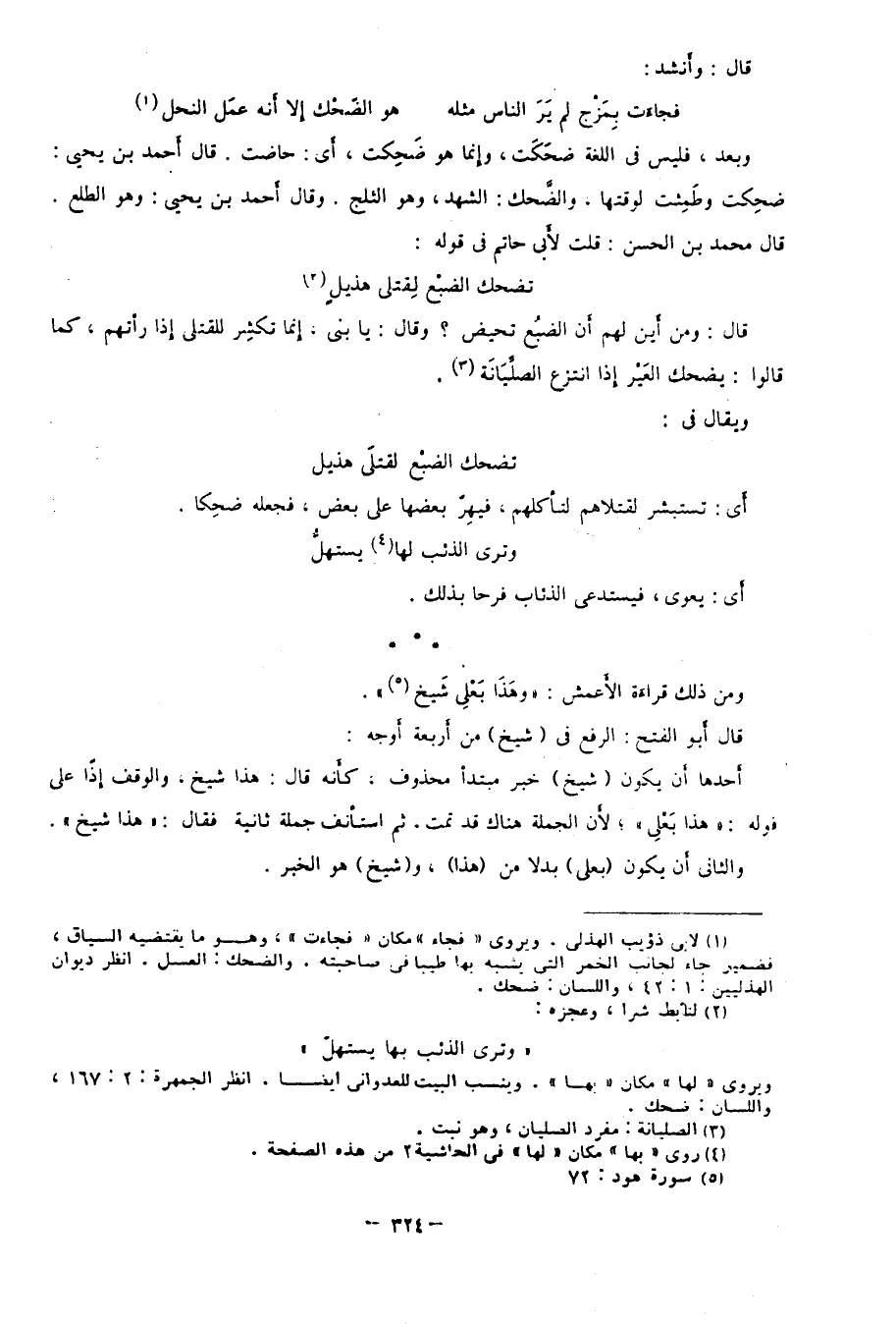 وبعد، فليس في اللغة ضحَكَت؛ وإنما هو ضَحِكت؛ أي: حاضت. قال أحمد بن يحيى: ضحِكت وطَمِثت لوقتها، والضَّحك: الشهد؛ وهو الثلج، وقال أحمد بن يحيى: وهو الطلع، قال محمد بن الحسن: قلت لأبي حاتم في قوله: