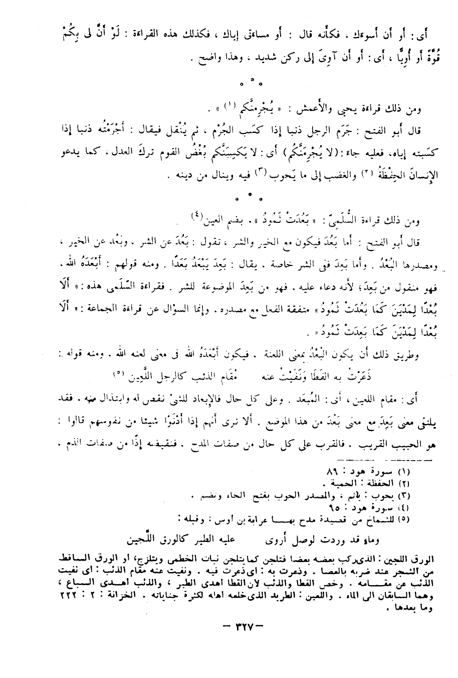 قال أبو الفتح: جَرَم الرجل ذنبًا إذا كسَب الْجُرْم، ثم ينقل فيقال: أَجْرَمْتُه ذنبًا إذا كسبته إياه، فعليه جاء: "لَا يُجْرِمَنَّكُم" أي: لا يَكْسِبَنَّكم بُغْضُ القوم تركَ العدل، كما يدعو الإنسان الحِفْظَة2 والغضب إلى ما يَحوب3 فيه وينال من دينه.