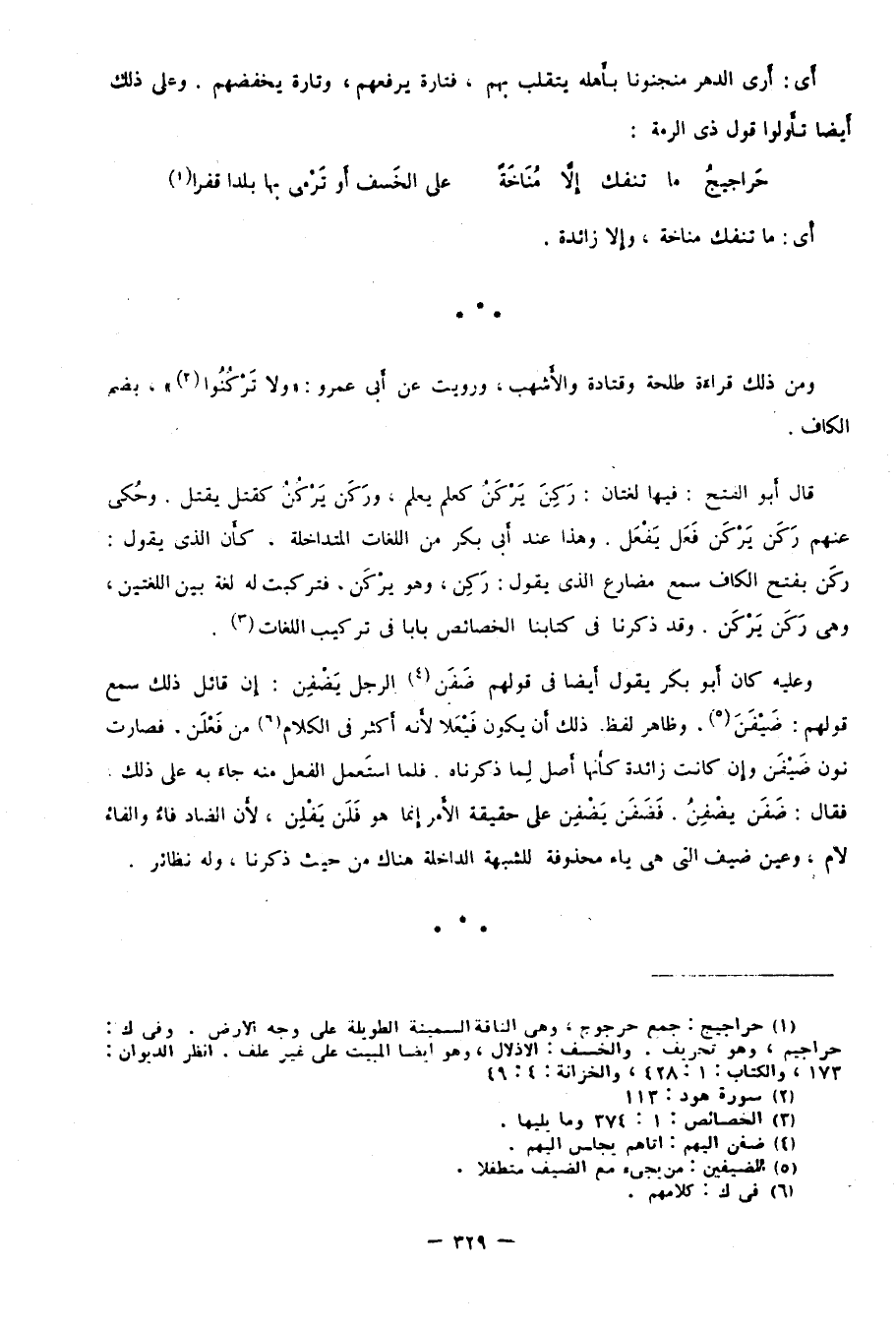 وعليه كان أبو بكر يقول أيضًا في قولهم ضَفَن4 الرجل يَضْفِن: إن قائل ذلك سمع قولهم: ضَيْفَنَ5، وظاهر لفظ ذلك أن يكون فَيْعَلا؛ لأنه أكثر في الكلام6 من فَعْلَن؛ فصارت نون ضَيْفَن وإن كانت زائدة كأنها أصل لما ذكرناه. فلما استعمل الفعل منه جاء به على ذلك فقال: ضَفَن يَضْفِن، فضَفَن يَضْفِن على حقيقة الأمر إنما هو فَلَن يَفْلِن؛ لأن الضاد فاء والفاء لام، وعين ضيف التي هي ياء محذوفة للشبهة الداخلة هناك من حيث ذكرنا، وله نظائر.