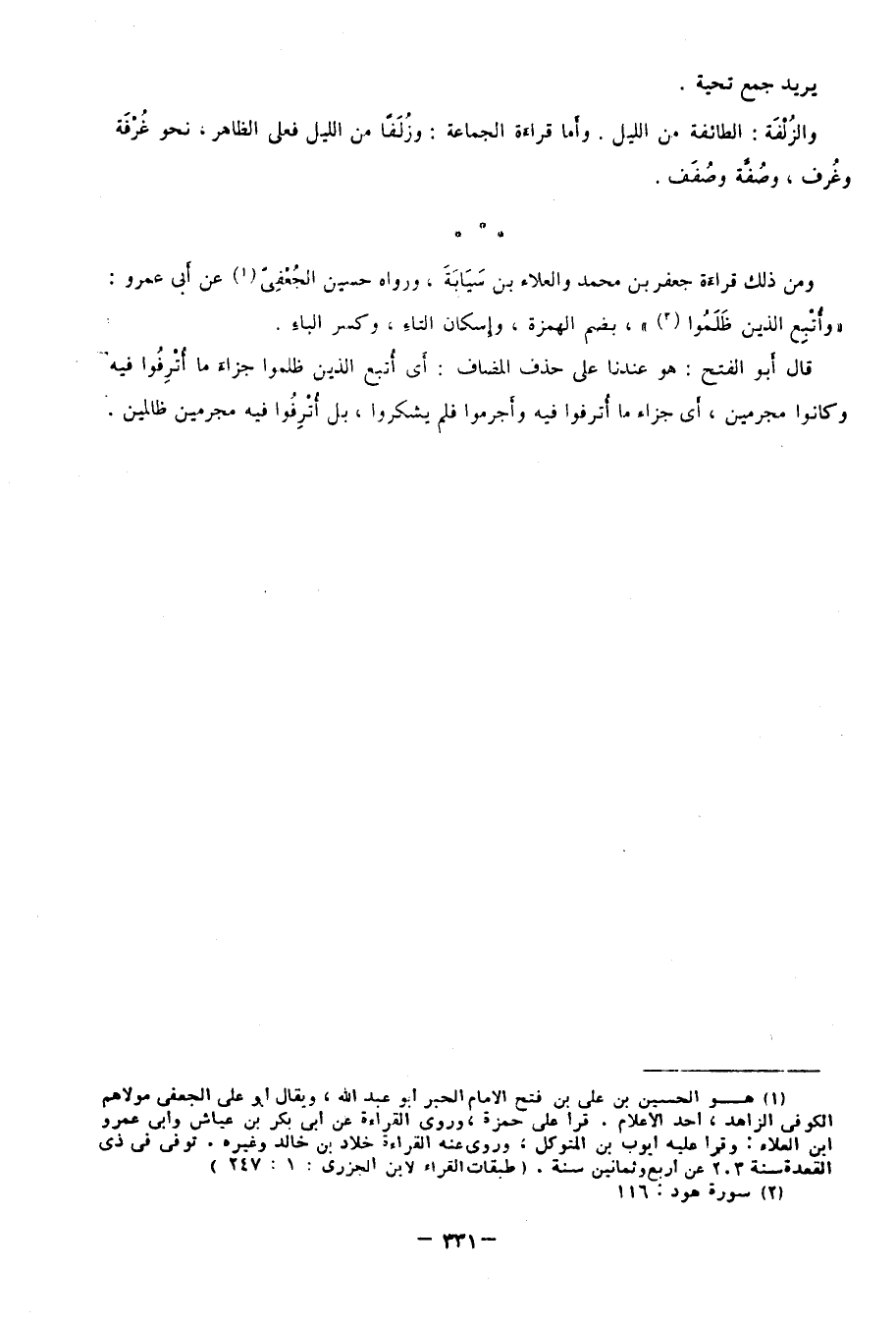 والزُّلْفَة: الطائفة من الليل. وأما قراءة الجماعة: {وَزُلَفًا مِنَ اللَّيْلِ} فعلى الظاهر، نحو: غرفة وغرف، وصُفَّة وصُفَف.