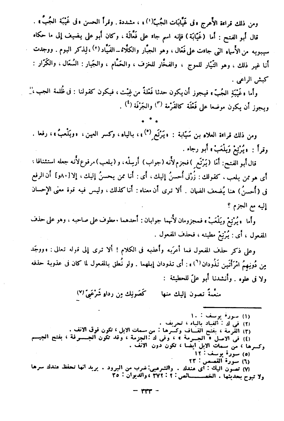 وعلى ذكر حذف المفعول فما أعرَبه وأعذَبه في الكلام! ألا ترى إلى قوله تعالى: {وَوَجَدَ مِنْ دُونِهِمُ امْرَأَتَيْنِ تَذُودَانِ} 6 أي: تذودان إبلهما، ولو نطق بالمفعول لما كان في عذوبة حذفه ولا في علوه. وأنشدنا أبو علي للحطيئة: