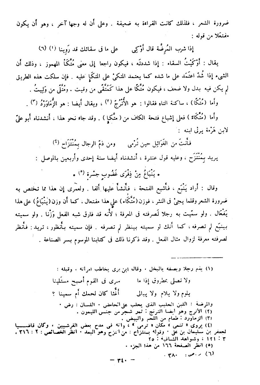 وقال: أراد يَنْبَع، فأشبع الفتحة، فأنشأ عليه ألفًا. ولعمري إن هذا مما تختص به ضرورة الشعر وقلما يجيء في النثر، فوزن "مُتَّكَاء" على هذا مفتعال، كما أن وزن "يَنْبَاعُ" على هذا يَفْعَال، ولو سميت به رجلًا لصرفته في المعرفة؛ لأنه قد فارق شبه الفعل وَزْنًا، ولو سميته بينبع لم تصرفه، كما أنك لو سميته بينظر لم تصرفه، فإن سميته بأَنظور، تريد: فأنظر؛ لصرفته معرفة لزوال مثال الفعل. وقد ذكرنا ذلك في كتابنا الموسوم بسر الصناعة.