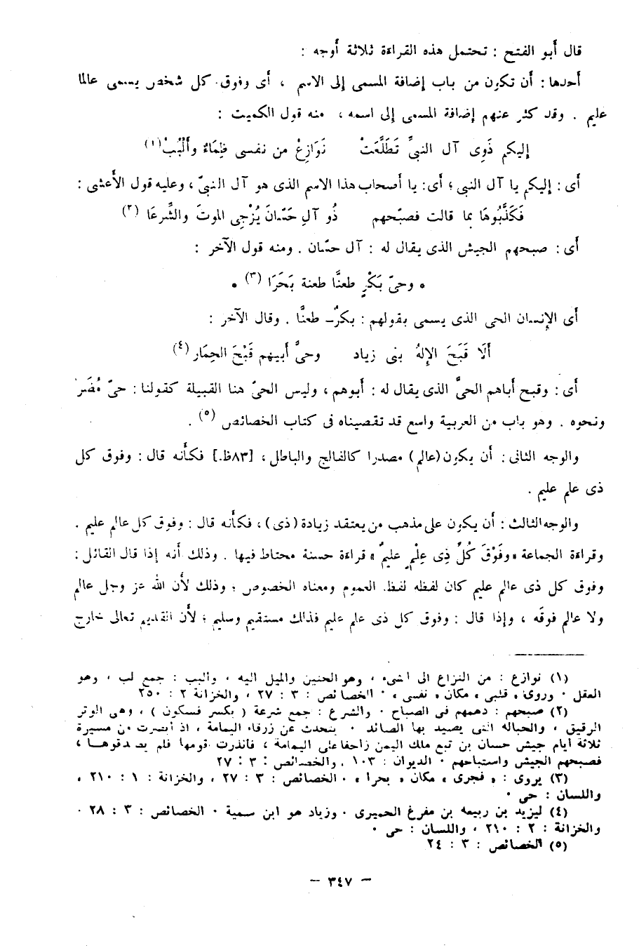 وقراءة الجماعة: {وَفَوْقَ كُلِّ ذِي عِلْمٍ عَلِيمٌ} قراءة حسنة محتاط فيها؛ وذلك أنه إذا قال القائل: وفوق كل ذي عالم عليم، كان لفظه لفظ العموم ومعناه الخصوص؛ وذلك لأن الله عز وجل عالم ولا عالم فوقه، وإذا قال: وفوق كل ذي علم عليم، فذلك مستقيم وسليم؛ لأن القديم تعالى خارج