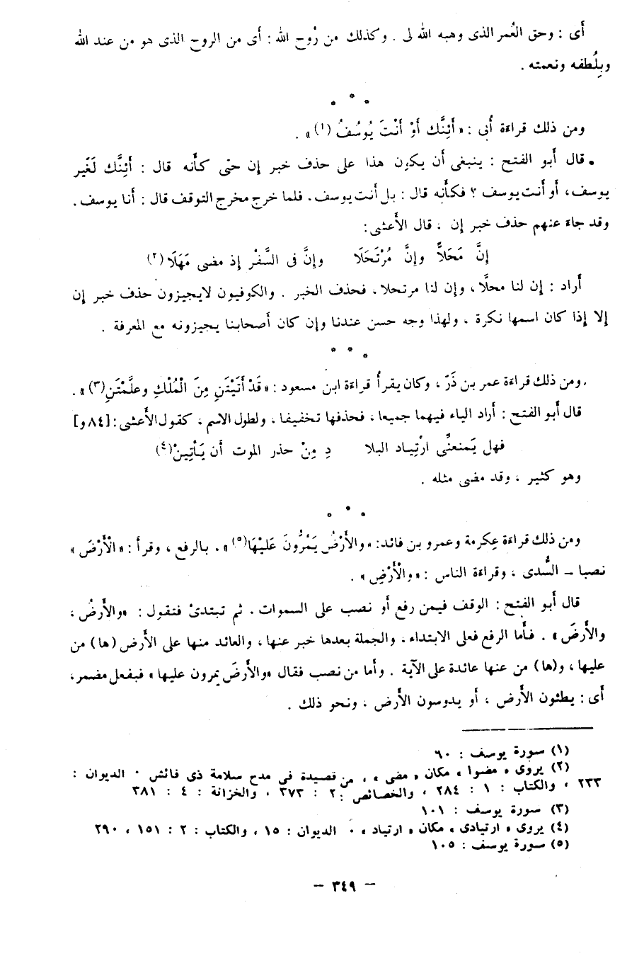 ومن ذلك قراءة عكرمة وعمرو بن فائد: "والأرضُ يَمُرُّونَ عَلَيْهَا"5 بالرفع، وقرأ: "الأرضَ" نصبًا السدي، قراءة الناس: {والْأَرْضِ} .