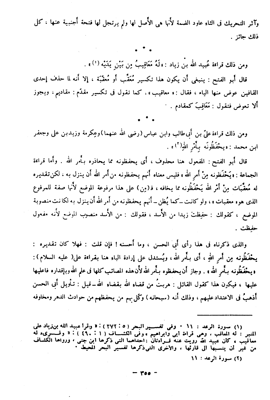 قال أبو الفتح: المفعول هنا محذوف؛ أي: يحفظونه مما يحاذره بأمر الله. وأما قراءة الجماعة: {يَحْفَظُونَهُ مِنْ أَمْرِ اللَّهِ} فليس معناه أنهم يحفظونه من أمر الله أن ينزل به؛ لكن تقديره: له مُعَقِّبَات من أمر الله يحفظونه مما يخافه، فـ"من" على هذا مرفوعة الموضع؛ لأنها صفة للمرفوع الذي هو "معقبات"، ولو كانت -كما يُظن- أنهم يحفظونه من أمر الله أن ينزل به لكانت منصوبة الموضع؛ كقولك: حفِظت زيدًا من الأسد، فقولك: من الأسد، منصوب الموضع؛ لأنه مفعول حفِظت.