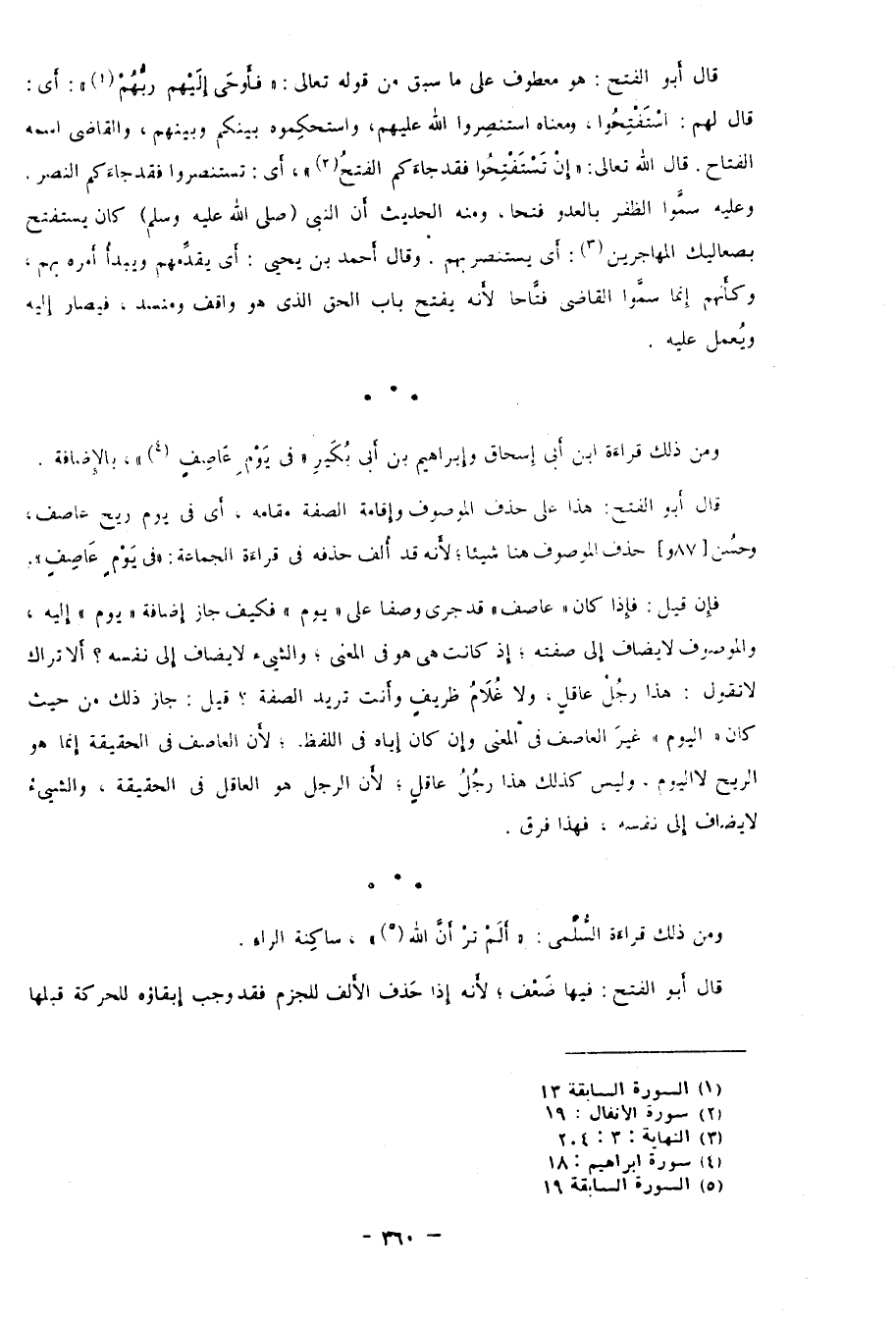 قال أبو الفتح: هو معطوف على ما سبق من قوله تعالى: {فَأَوْحَى إِلَيْهِمْ رَبُّهُمْ} 1 أي: قال لهم: اسْتَفْتِحُوا، ومعناه: استنصِروا الله عليهم، واستحكموه بينكم وبينهم، والقاضى اسمه الفتاح، قال الله تعالى: {إِنْ تَسْتَفْتِحُوا فَقَدْ جَاءَكُمُ الْفَتْحُ} 2 أي: تستنصروا فقد جاءكم النصر. وعليه سَمَّوا الظفر بالعدو فتحًا، ومنه الحديث أن النبي -صلى الله عليه وسلم- كان يستفتح بصعاليك المهاجرين3؛ أي: يستنصر بهم. وقال أحمد بن يحيى: أي يقدِّمهم ويبدأ أمره بهم، وكأنهم إنما سَمَّوا القاضي فتَّاحًا لأنه يفتح باب الحق الذي هو واقف ومنسد، فيُصار إليه ويُعمل عليه.