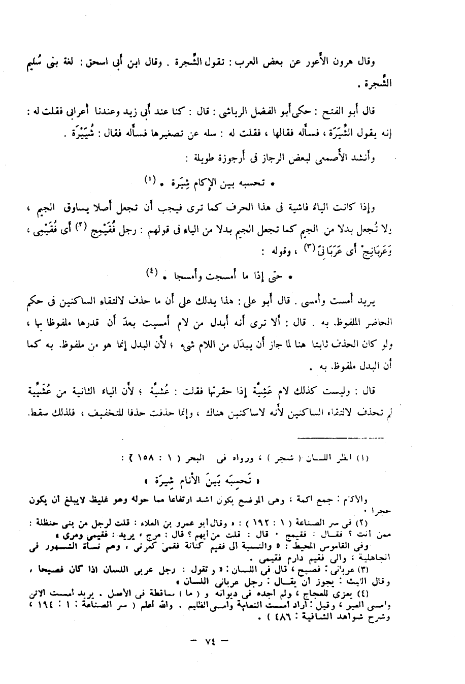 4 يُعزى للعجاج، ولم أجده في ديوانه و"ما" ساقطة في الأصل. يريد أمست الأتن وأمسى العير، وقيل: أراد أمست النعامة وأمسى الظليم، والله أعلم. سر الصناعة: 1/ 194، وشرح شواهد الشافية: 486.