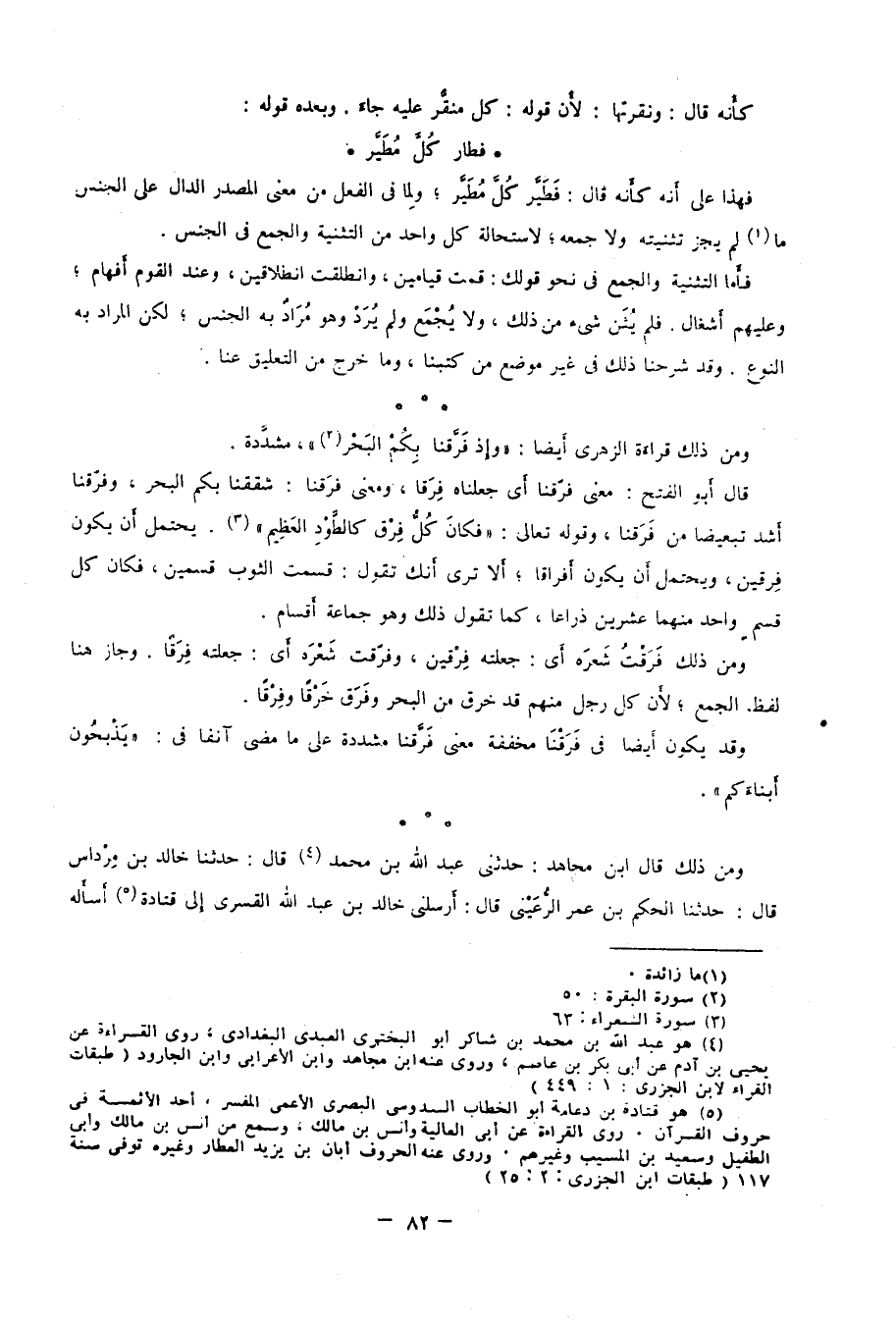 قال أبو الفتح: معنى "فرَّقنا" أي: جعلناه فِرَقًا، ومعنى "فرَقنا": شققنا بكم البحر، وفرَّقنا أشد تبعيضًا من فرَقنا، وقوله تعالى: {فَكَانَ كُلُّ فِرْقٍ كَالطَّوْدِ الْعَظِيمِ} 3 يحتمل أن يكون فرقين، ويحتمل أن يكون أفراقًا؛ ألا ترى أنك تقول: قسمت الثوب قسمين، فكان كل قسم واحد منهما عشرين ذراعًا، كما تقول ذلك وهو جماعة أقسام.