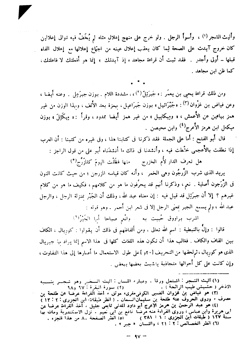 يريد: الذي شرب الزَّرجون وهي الخمر، وأنه كان قياسه المزرجن؛ من حيث كانت النون في الزرجون أصلية. نعم، وذكرنا أنهم قد يحرفون ما هو من كلامهم، فكيف ما هو من كلام غيرهم؟ إلا أن جبرَئِل قد قيل فيه: إن معناه عبد الله؛ وذلك أن الجبر بمنزلة الرجل، والرجل عبد الله، ولم يسمع الجبر بمعنى الرجل إلا في شعر ابن أحمر، وهو قوله: