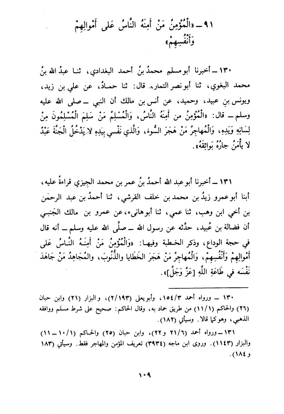130 - أَخْبَرَنَا أَبُو مُسْلِمٍ مُحَمَّدُ بْنُ أَحْمَدَ الْبَغْدَادِيُّ، ثنا عَبْدُ اللَّهِ بْنُ مُحَمَّدٍ الْبَغَوِيُّ، ثنا أَبُو نَصْرٍ التَّمَّارُ، قَالَ: ثنا حَمَّادٌ، عَنْ عَلِيِّ بْنِ زَيْدٍ وَيُونُسَ بْنِ عُبَيْدٍ وَحُمَيْدٍ، عَنْ أَنَسِ بْنِ مَالِكٍ، أَنَّ النَّبِيَّ صَلَّى اللهُ عَلَيْهِ وَسَلَّمَ قَالَ: «§الْمُؤْمِنُ مَنْ أَمِنَهُ النَّاسُ، وَالْمُسْلِمُ مَنْ سَلِمَ الْمُسْلِمُونَ مِنْ لِسَانِهِ وَيَدِهِ، وَالْمُهَاجِرُ مَنْ هَجَرَ السُّوءَ، وَالَّذِي نَفْسِي بِيَدِهِ لَا يَدْخُلُ الْجَنَّةَ عَبْدٌ لَا يَأْمَنُ جَارُهُ بَوَائِقَهُ»